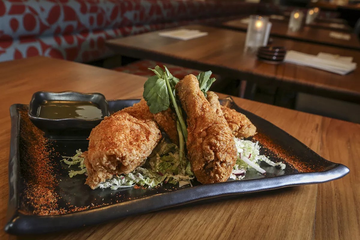 There’s also a lengthy list of hot offerings that includes matzo-crusted fried chicken, which earned a cult following in New York. The desiccated crackers, in combination with egg whites and a Japanese chili spice, create a crust that is more about texture than flavor. It fuses with the skin and creates a superlight, crunchy exterior that complements the juicy flesh inside. An accompanying dish of wasabi-spiked honey is a smart analog for the hot sauce and honey that are often drizzled over Southern-style fried chicken.