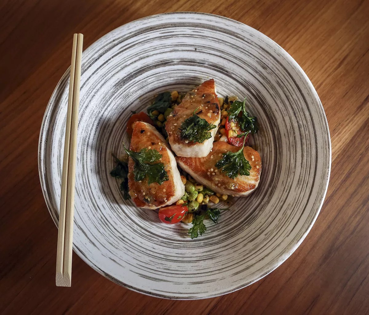 Another notable plate bears three gently browned hunks of cobia deftly seasoned and seared. A moment less on the grill would’ve left the sturdy, juicy flesh chewy, and a moment longer would have dried it out. The taste and texture are similar to swordfish. A bright, acidic sauce with tomatillo and sharp ponzu, combined with sweet corn and charred cherry tomatoes, sharpens each bite.