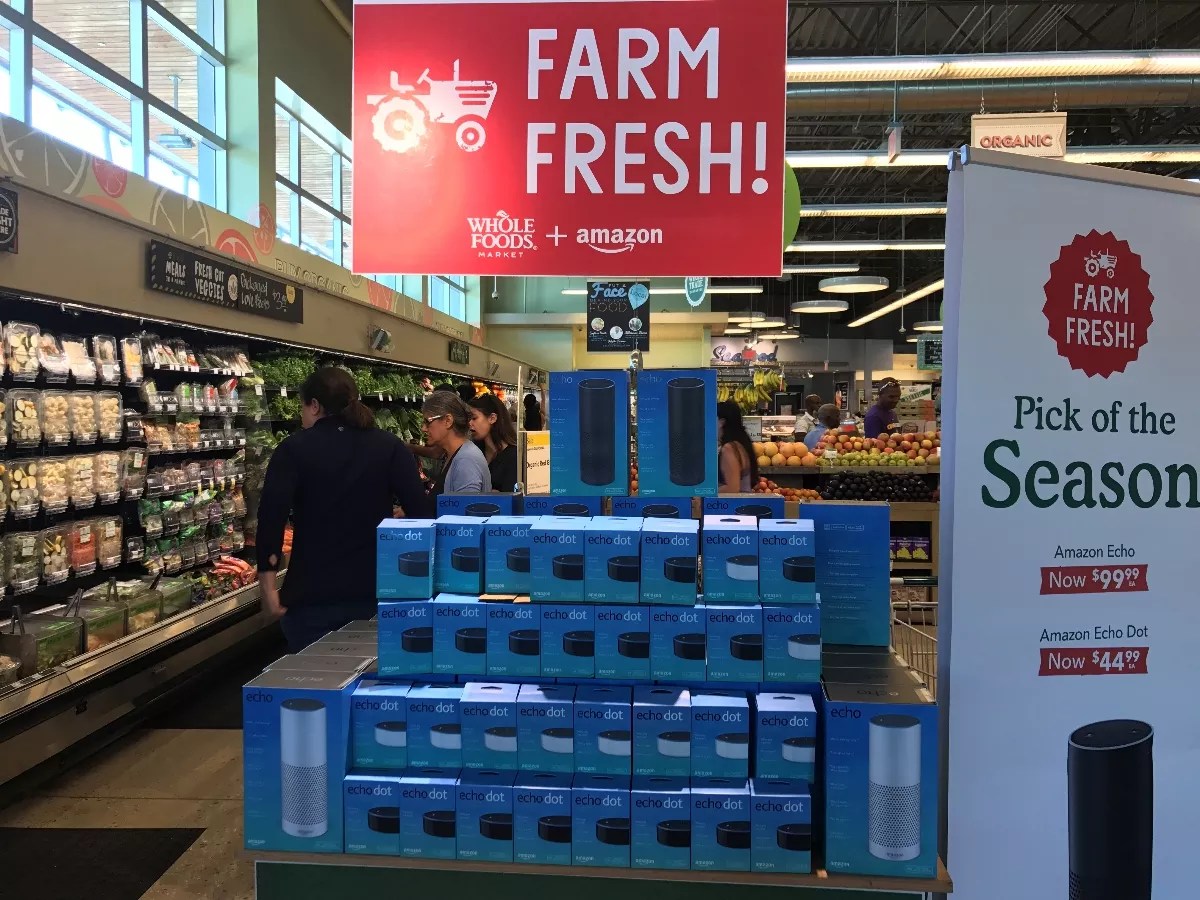 A visit to the North Miami store last night showed Amazon worked fast to implement the changes. At the entrance, a floor display touted “farm fresh” Amazon Echos for $99.99.