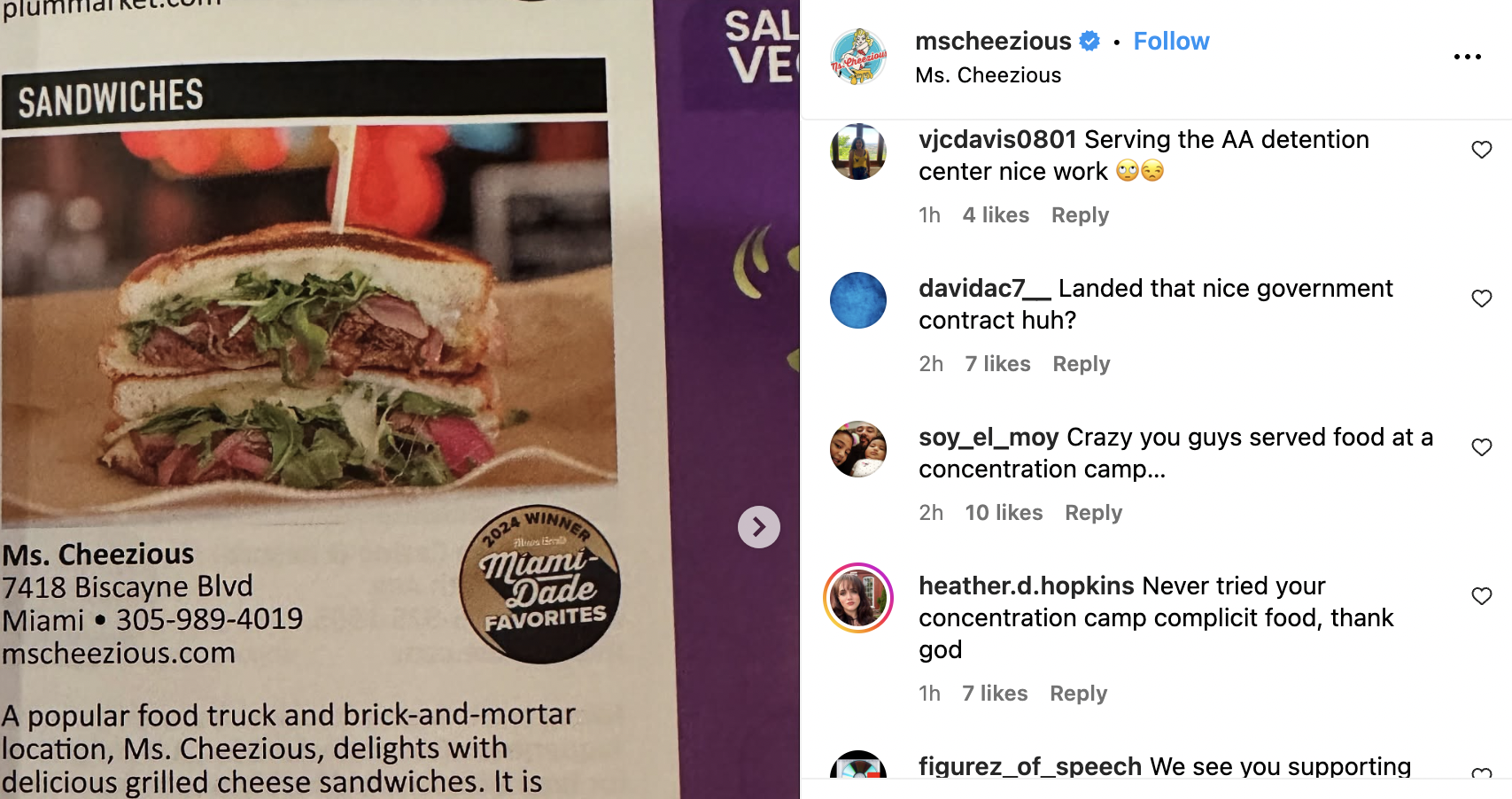 A food truck operated by locally based Ms. Cheezious also appeared in the TikTok video. Ms. Cheezious is a private company and not a franchise, and those who took issue with Alligator Alcatraz didn’t hesitate to share their thoughts on Ms. Cheezious’ Instagram account.
