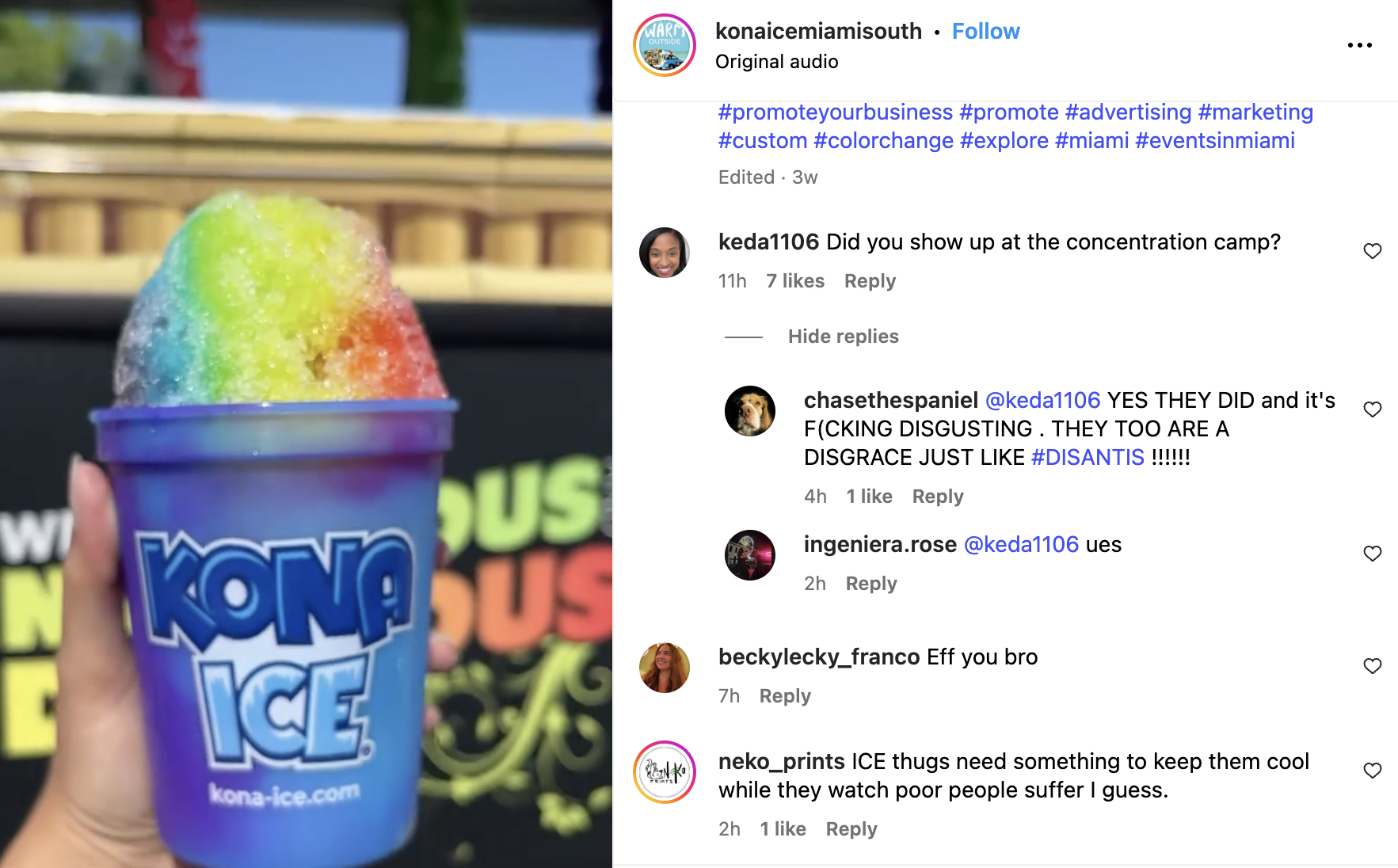 Kona Ice’s Miami franchisee was hit with criticism on Instagram, including this from one commenter: “Did you show up at the concentration camp?” Opined another: “ICE thugs need something to keep them cool while they watch poor people suffer, I guess.”