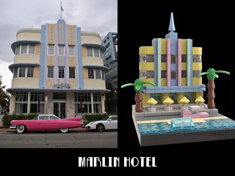 Olsen’s Miami Beach Art Deco Skyline model includes replicas of the Marlin Hotel and Delano on Collins Avenue and the Hotel Breakwater South Beach and Hilton Grand Vacations at McAlpin-Ocean Plaza on Ocean Drive. The set neatly places them side-by-side. To give the model that extra Art Deco District flair, it also comes with Lego palm trees, sidewalk umbrella tables, retro cars, and an ocean with crashing waves.