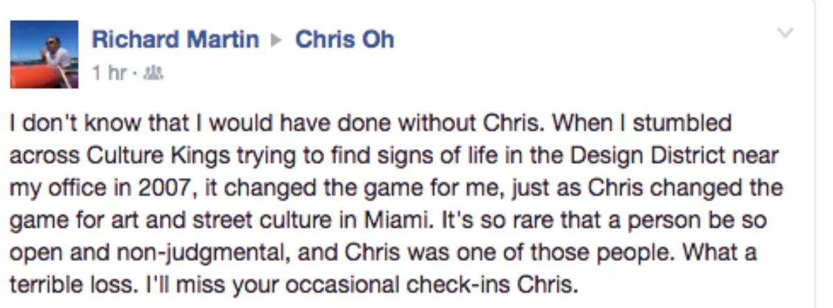 Oh was born in New York and moved to South Florida in the early ’90s. His Culture Kings became a go-to spot for exclusive street wear, complete with a sticker-plastered bathroom. Along with fellow artists Cristina Gonzalez,
