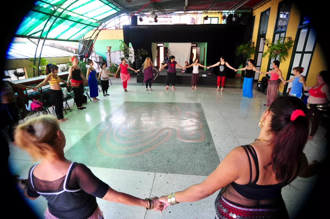 Awash in sunlight, around 50 women stand in a circle on the rooftop performance space of Casa Gaia in Old Havana, Cuba. Karen Rodríguez guides them through a series of improvisational movements. Soft spoken and radiant, Rodríguez encourages the participants to walk around freely, dancing and moving as they wish. Some whirl around extravagantly; others glide past with elegant reserve. Dancing pairs or small groups form for a few seconds, then break off into new formations. This cross section of Cuban women varies widely in shape, size, age, and color, a diversity that’s not uniquely Cuban, but still shines in unique contrast to the western image of belly dance as young, slender, women in skimpy costumes.