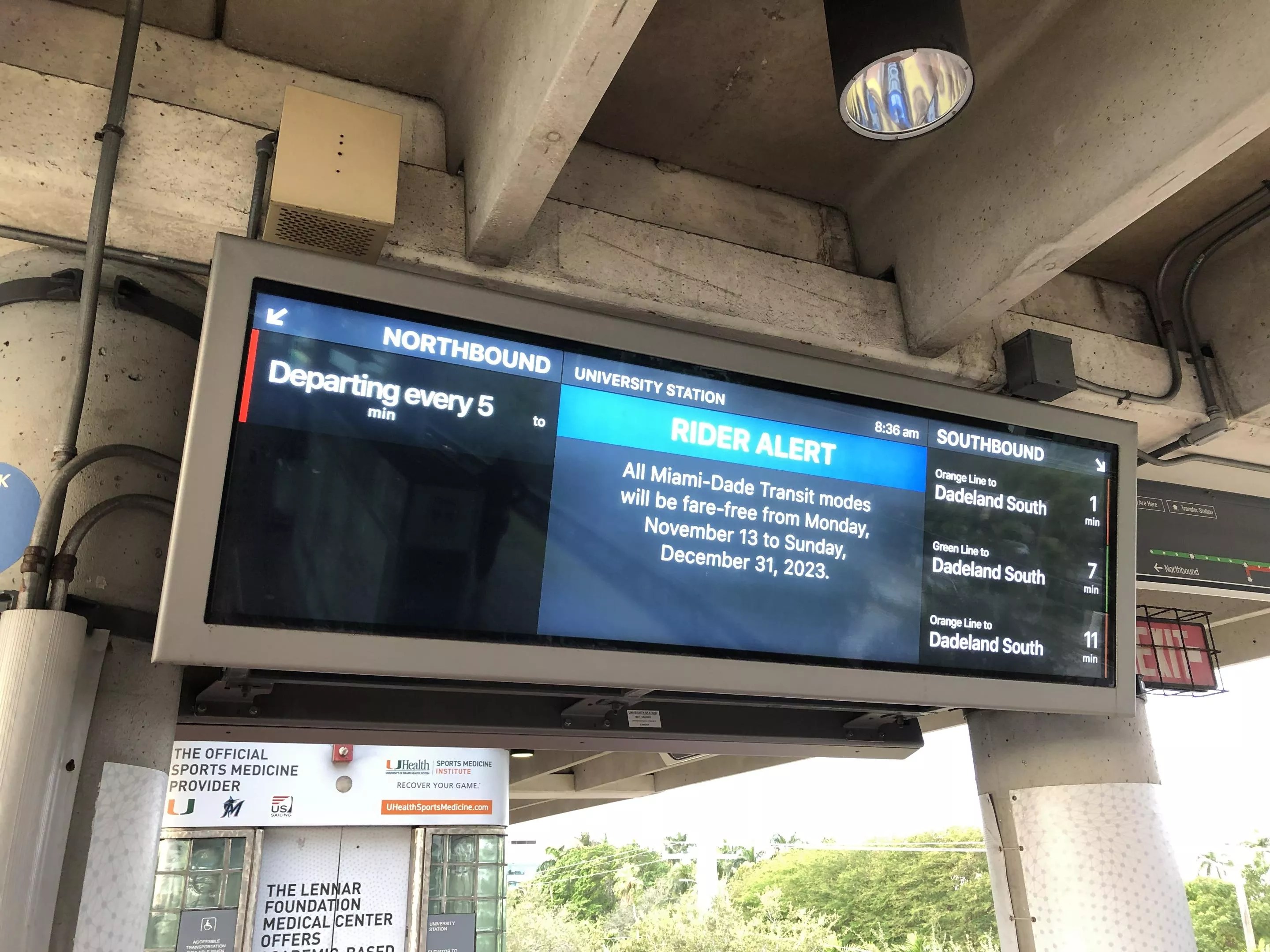 When I get on, I find the train car filled with people – not packed, but most of the seats are taken. Who says no one in Miami takes transit? In fact, according to the county Department of Transportation’s most recent State of the System report, 245,700 average weekday riders use Miami-Dade Transit. It’ll be interesting to see how that number changes during and after the free period.