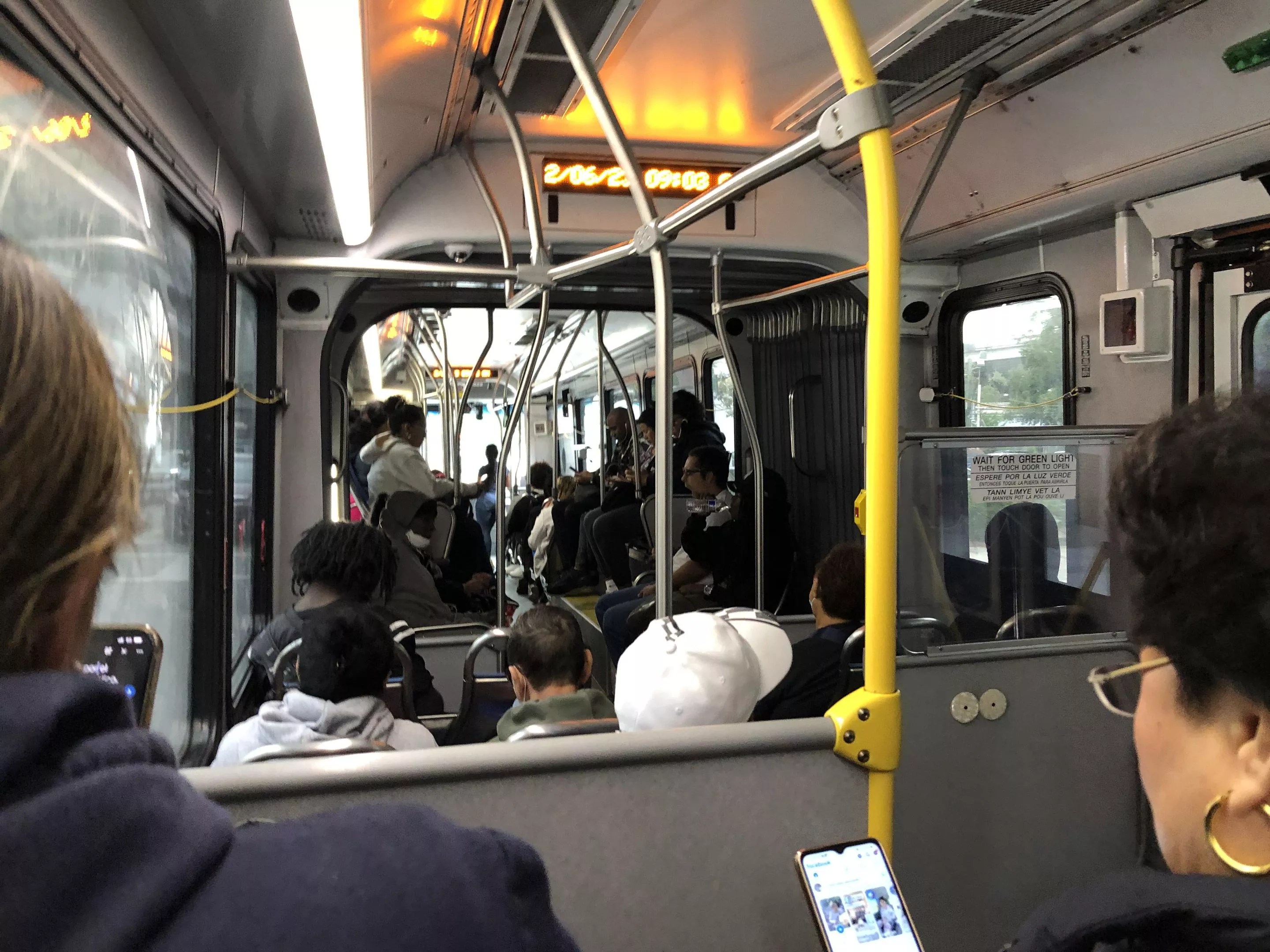 Nearly every seat is taken. Again, people of all ages and races are on board. A gentleman in a hooded jacket and surgical mask talks to a woman across his seat. An elderly gentleman speaks with a woman in a striped shirt. People watch TikToks on their phones. The roar of the engine drowns out conversation.