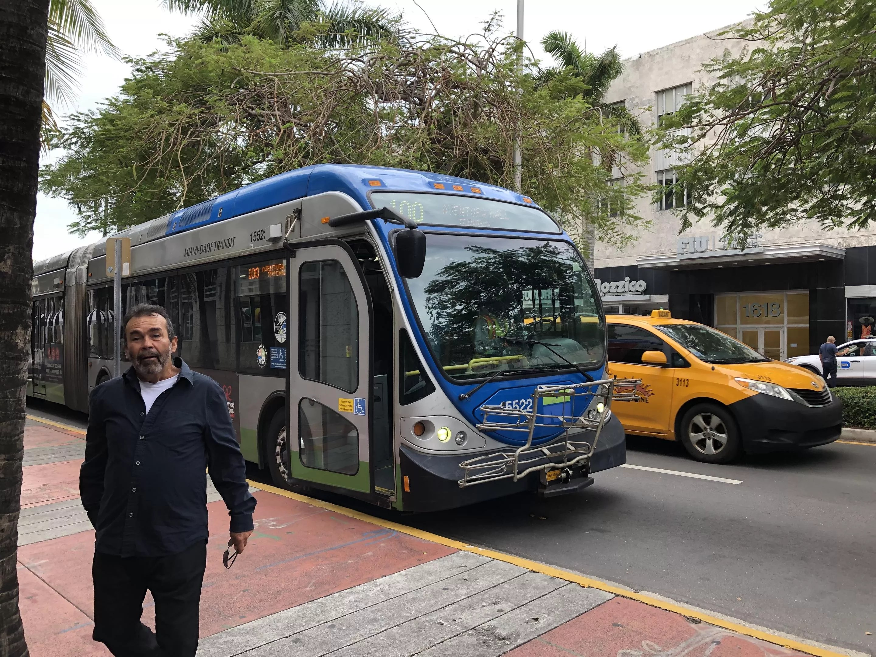 The bus finally reaches Fifth Street and Alton Road in Miami Beach. Lots of people begin to queue in the aisle to disembark. The fluorescent lights go on every time the doors open and turn off when they shut.