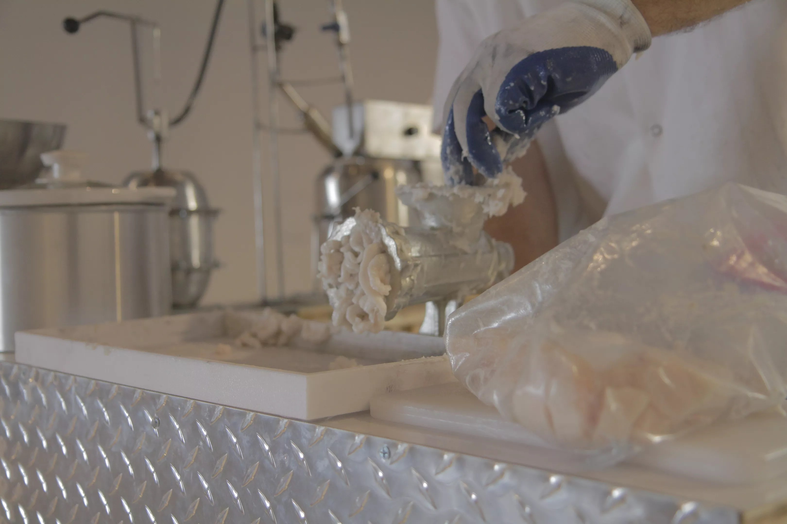The piece encompasses two independent factories, each managed and operated by the respective artists. Tamir’s factory produces helium-filled balloons, in various shapes and colors, that rise to the ceiling before falling to the floor over a 24-hour period; Zin’s factory renders an industrial byproduct made primarily from lard (pig fat) that is pressed on the floor and gradually builds up, hampering the function of his factory.