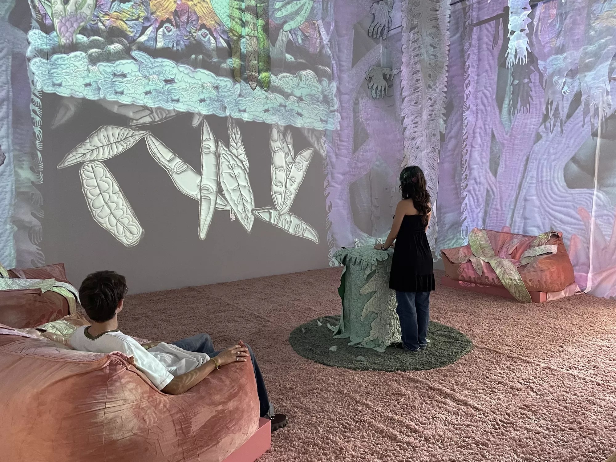 Miami-based artist Jen Clay invites viewers to explore a forest of quilted tree monsters through a sensory-inclusive, immersive installation and video-game animation in Eyes of the Skin at Locust Projects.