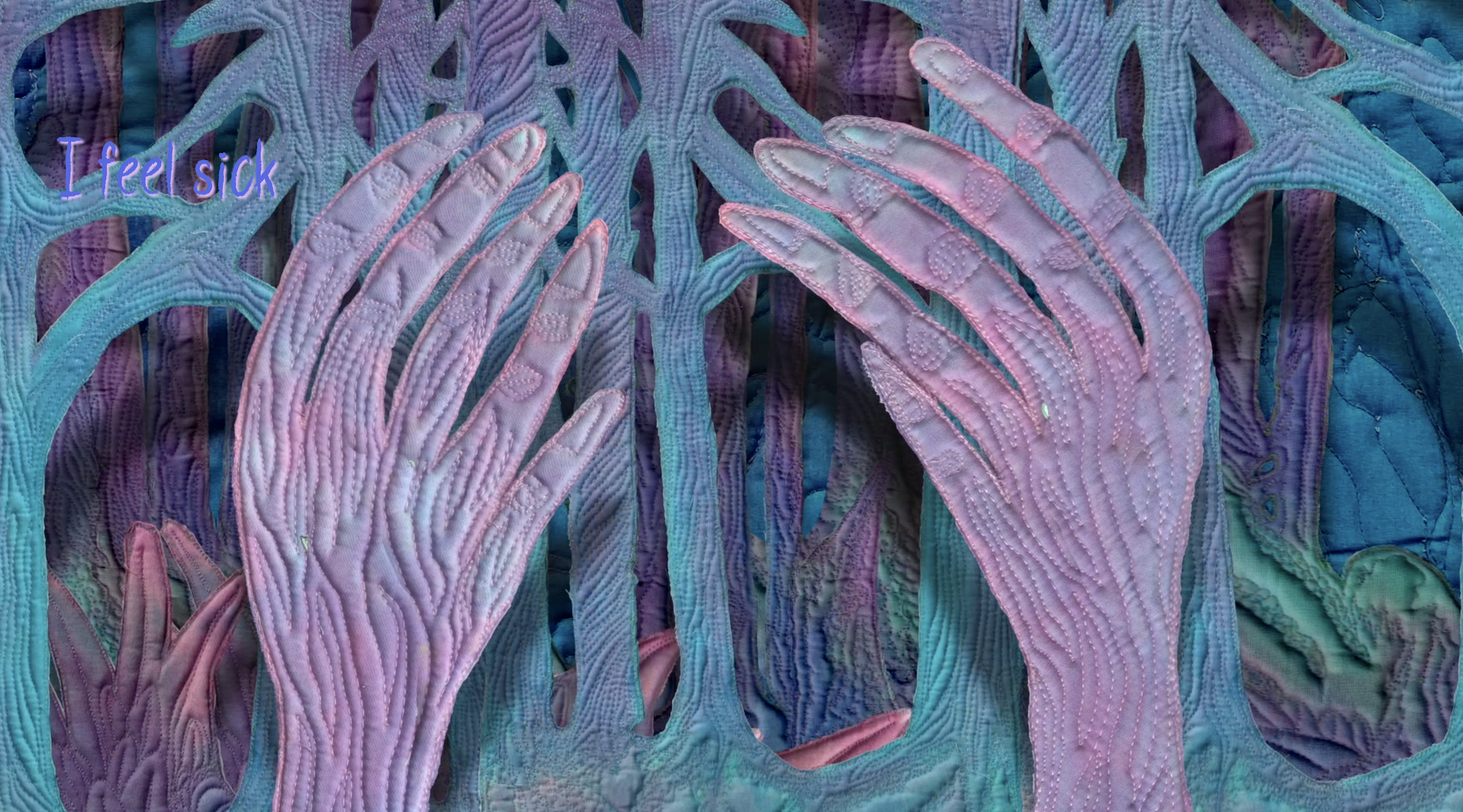The virtual monsters and settings, made from scrap fabric sourced from donations and thrift stores, among other sources, and digitally scanned into the game, draw inspiration from “creature” movies such as Sweetheart, The Blob, and Invasion of the Body Snatchers. Clay finds supernatural or cosmic horror films where humans are faced with confronting or changing into an alien form of life to be a potent metaphor for the depersonalization experienced by the mentally unwell.