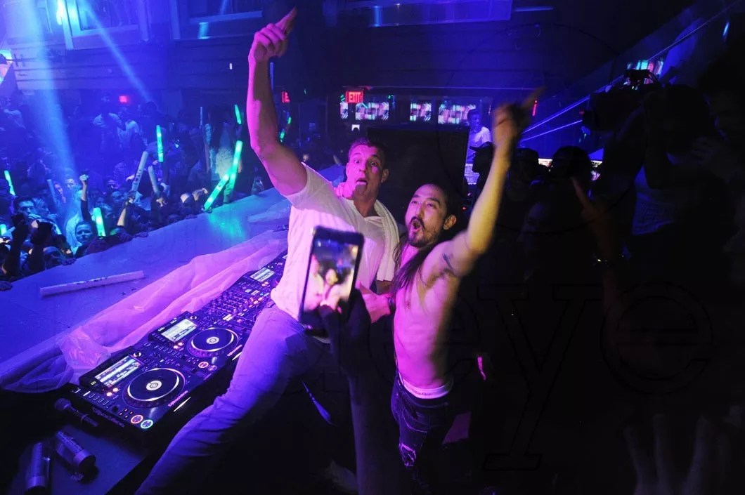 Steve Aoki and Rob Gronkowski at LIV: Cake, bottles, and jumping – that must mean Steve Aoki returned to LIV. He even got Rob Gronkowski hopping up with him.