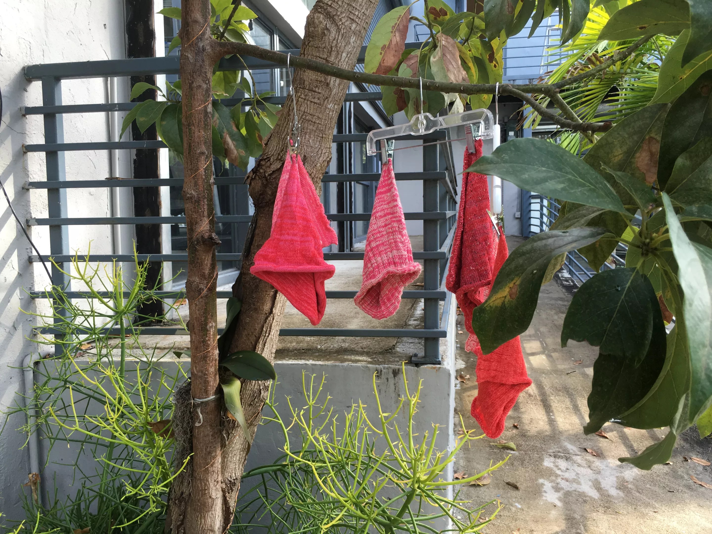 Pink pussyhats hang from a tree outside Levy’s shop.