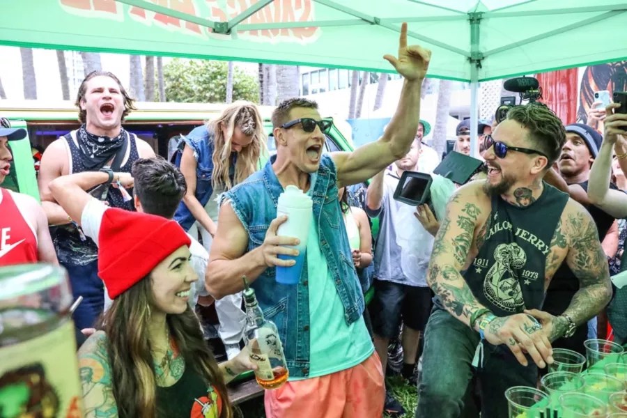 Former NFL player Rob Gronkowski and Sports Illustrated cover model Camille Kostek served up Sailor Jerry Savage Apple with brand ambassador Anthony Bohlinger at Gronk Beach on February 1.
