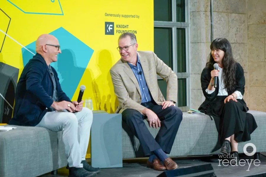 The Bass held an installment of the talk series Curator Culture. Following the recent opening of Haegue Yang’s exhibition, “In the Cone of Uncertainty,” the artist, along with NBC 6 chief meteorologist John Morales and host Tom Healy, discussed the ways different cultural and ethnic backgrounds can unite to address universal issues in a complicated future.