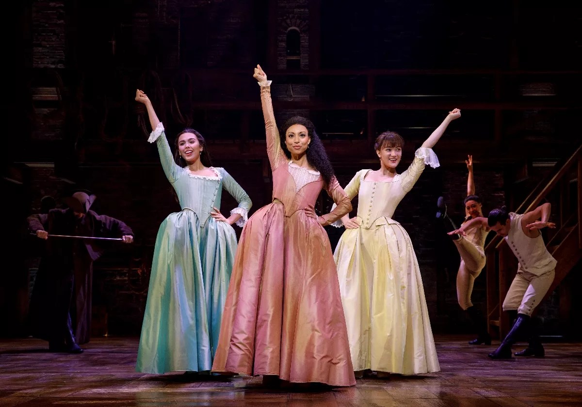 Julia K. Harriman (left), Sabrina Sloan, Isa Briones, and company (upstage) in Hamilton.