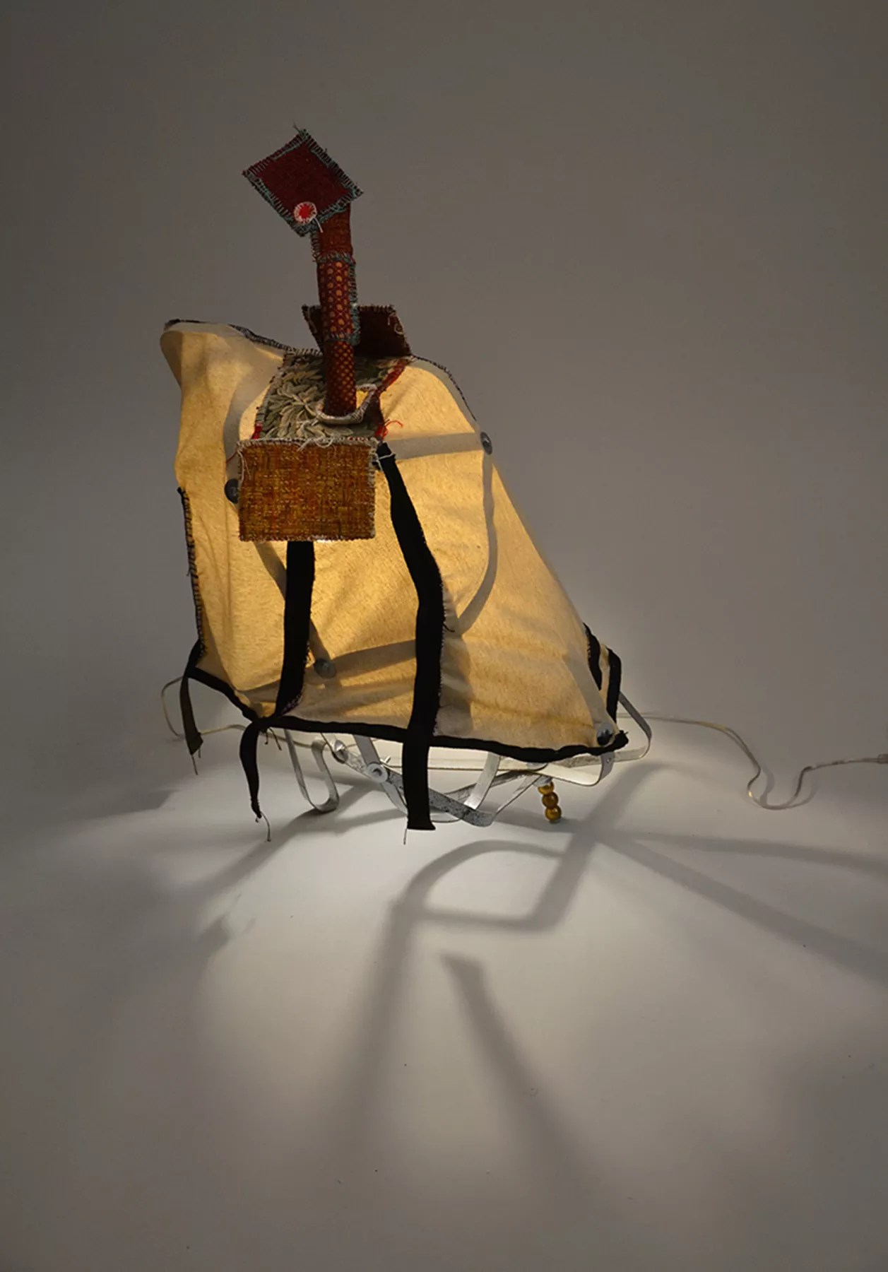 He succeeds in that goal. These lamp pieces are not ones you would typically see at upscale furniture stores around town; they’re structures composed of jagged, crude, and awkward frames that form skeletons draped with red, blue, and cream fabric. Though they’re not functional lighting accessories, Fischer’s pieces create intricate plays of light and shadow that envelop any space they inhabit. It’s a unique effect gallerist Nina Johnson was quick to notice.