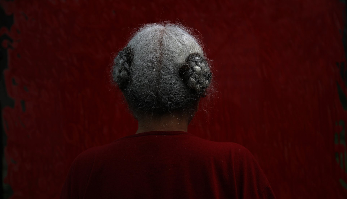 The woman is carrying items too. On top of her crown sits a wrapped bundle. She trails behind as a child straddles her hip.