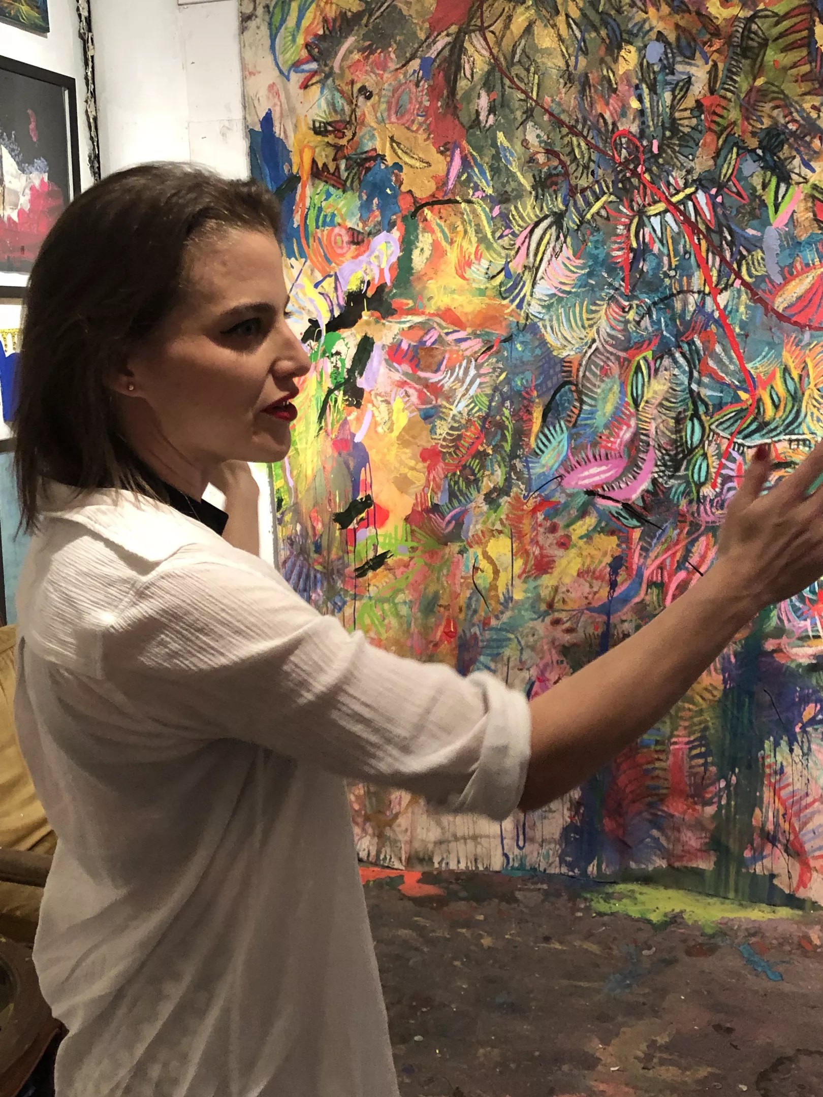 “I love having kids around to view the art,” she says while standing in her studio, filled with large canvases displaying her colorful artwork. The floor is splattered with paint because “art is messy,” she says.
