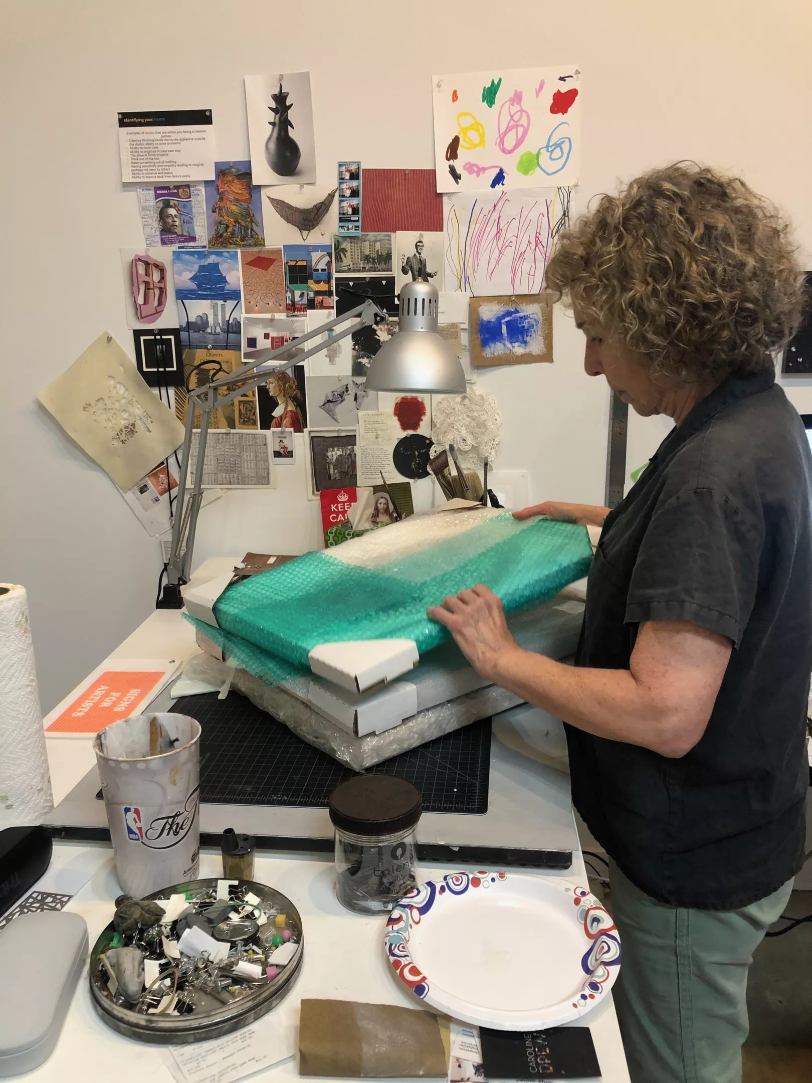 Then there’s Donna Ruff, whose intricate and meticulous cutout pieces on newsprint and other materials tell the story of refugees and their plight. She began creating these pieces during the Syrian refugee crisis and now is concentrating more on Mexico and Central America.