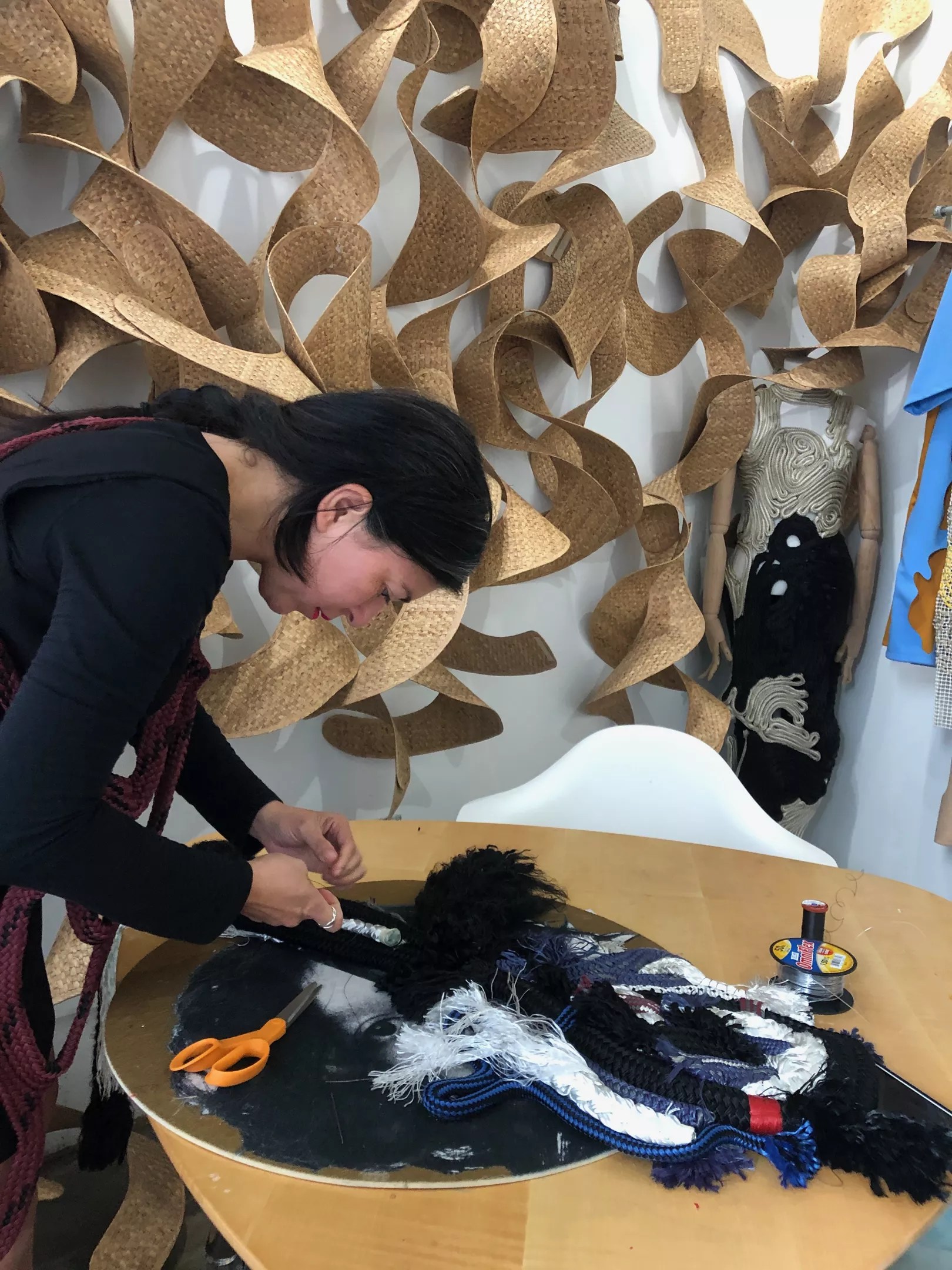 Lisu Vega in her studio at Laundromat with the straw hat installation on wall behind her.