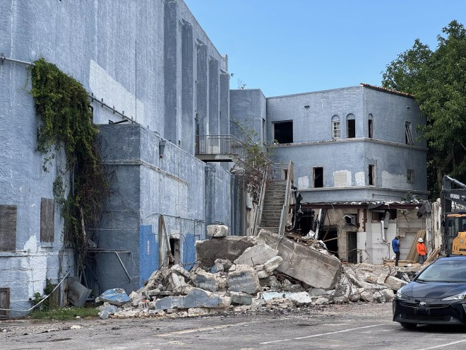 New Times editor and Grove resident Nicole Lopez-Alvar found curious residents, police, and contractors surrounding the playhouse Friday evening.