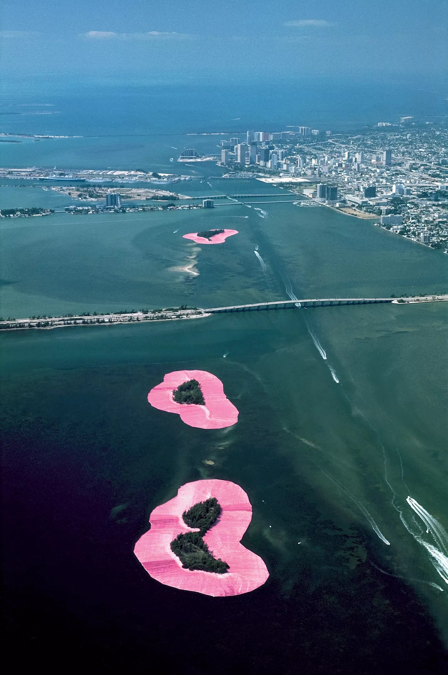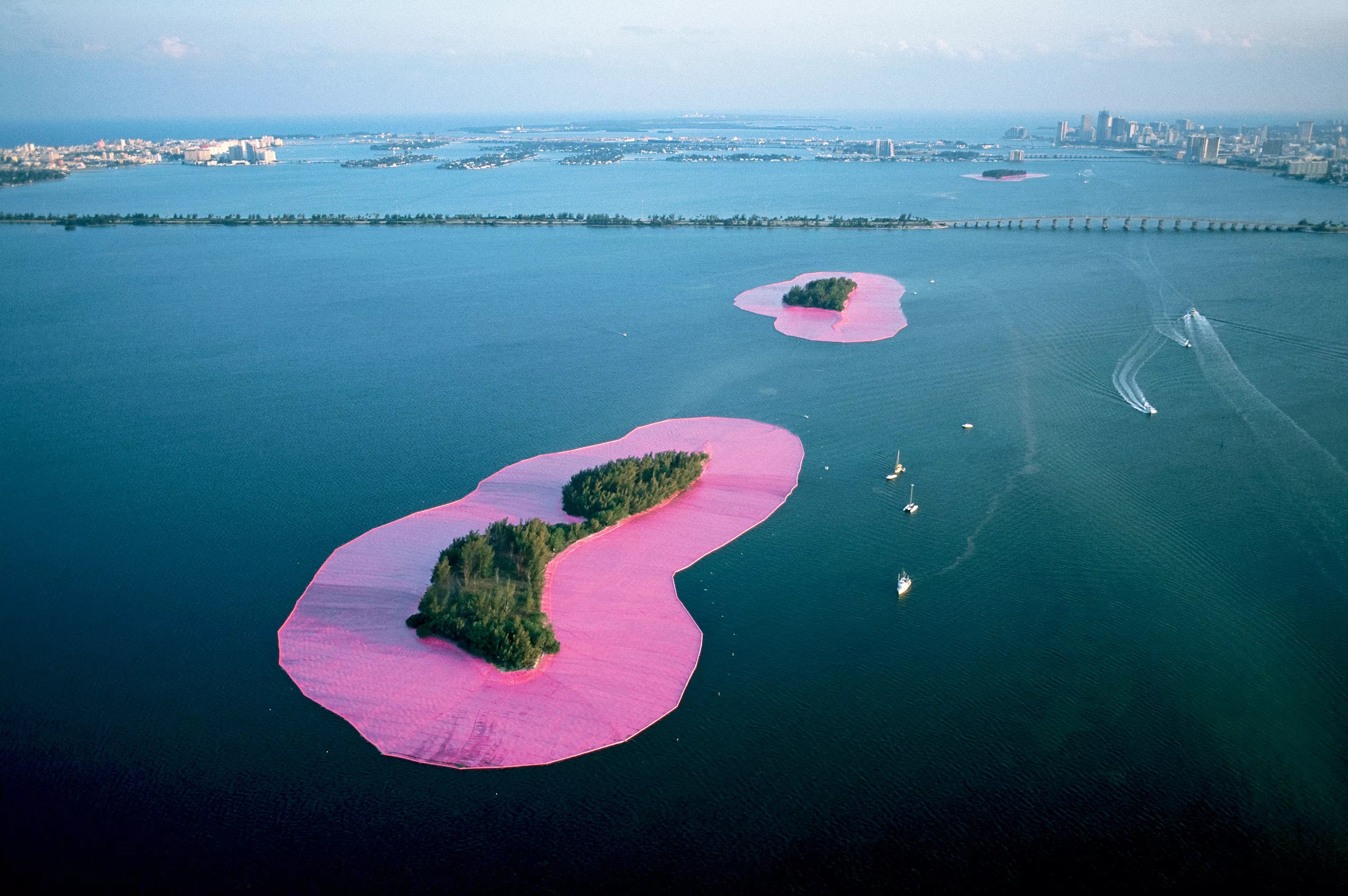 Surrounded Islands was a large-scale installation in Biscayne Bay. As its name implies, the project involved surrounding 11 islands in the bay between Haulover Park and the Venetian Causeway with pink polypropylene fabric. The material unfurled 200 feet from the shore of each island, totaling 6.5 million square feet of bright pink, all of which had to be specially made in Germany using massive, 15-foot-wide machines.