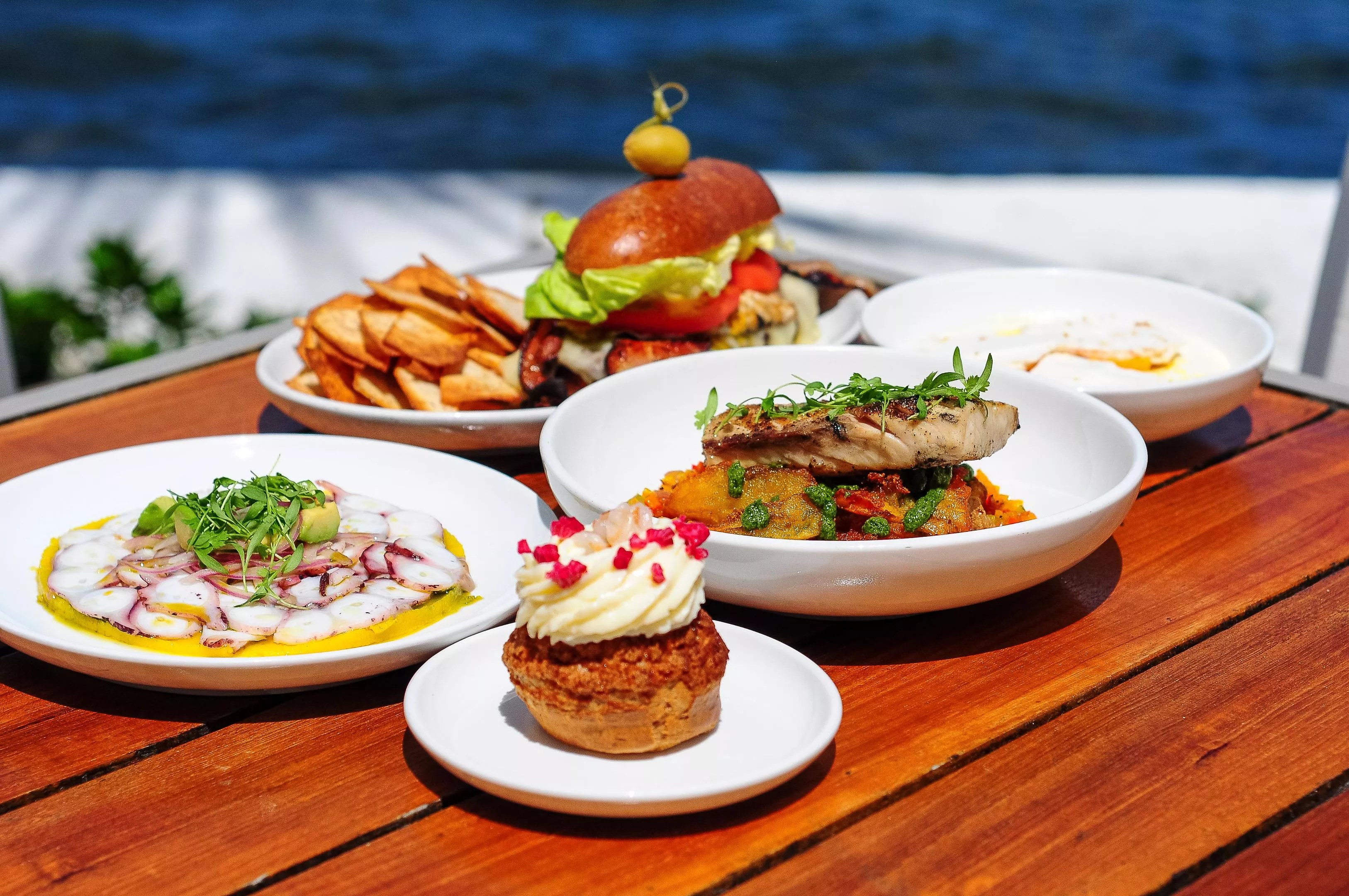 The porchetta is a fixed menu item for dinner. Lunch highlights include the grilled cobia and the Chivito sandwich. For dessert during lunch, guests can enjoy a cream puff filled with coconut-lychee pastry cream drizzled with white chocolate ganache and raspberries. During dinner, there’s a choice of an ice cream sandwich with guava and yogurt gelato or the white chocolate cremeux made with local peaches, orange granita, and meringue.