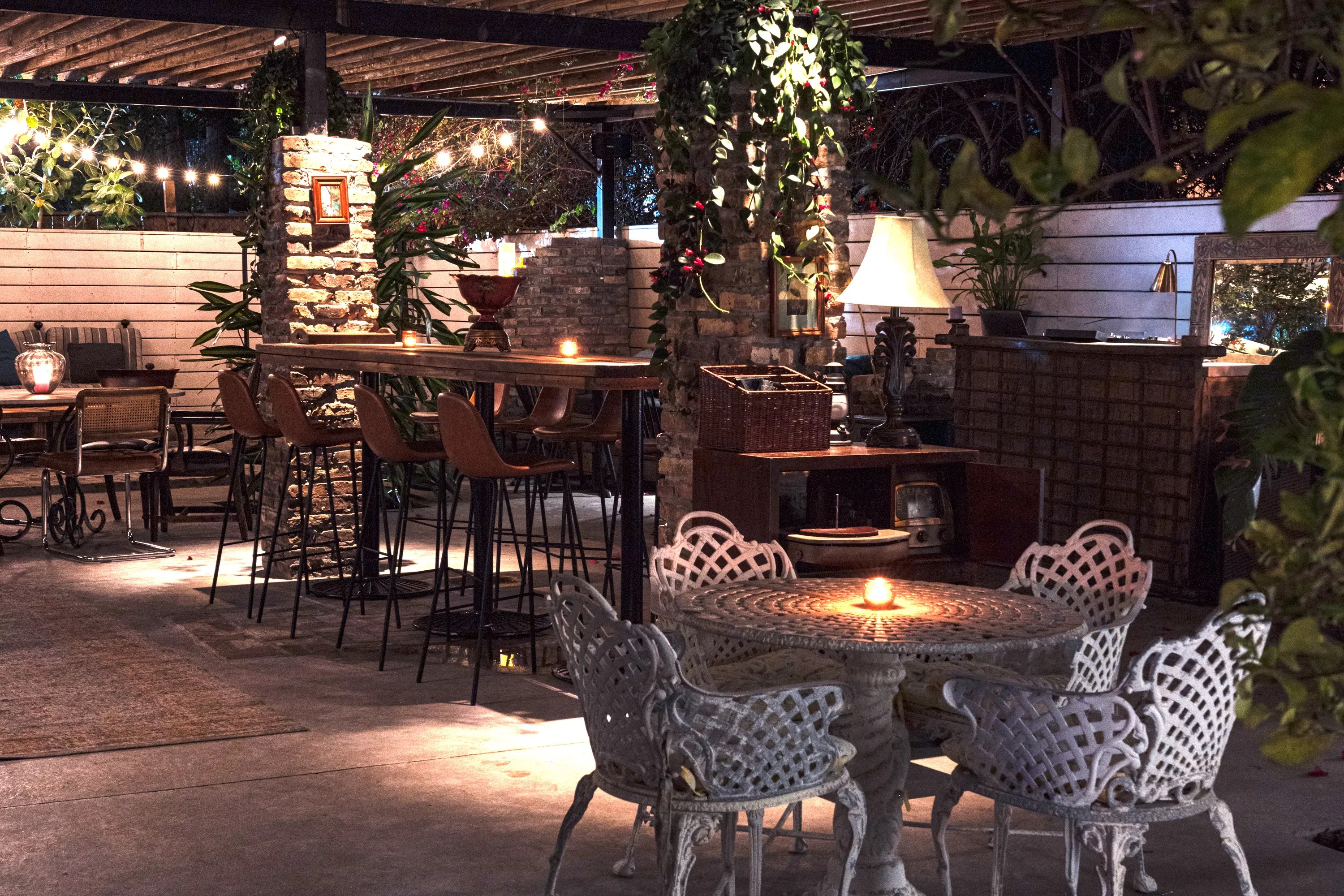 The space itself is designed to evoke a sense of nostalgia, with rustic touches like clay brick, worn wood, and lush greenery framing the open patio.