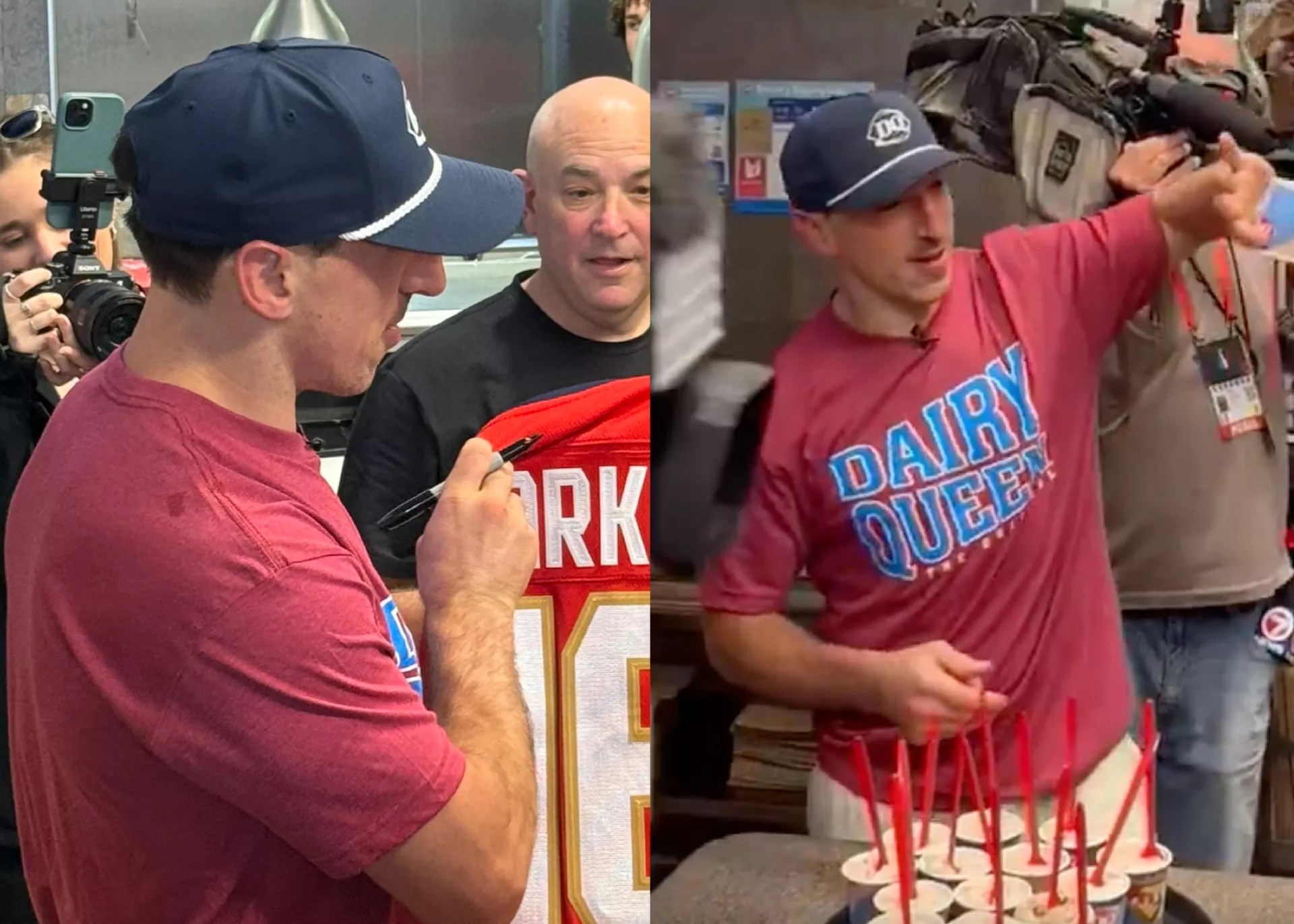 Dozens of Panthers fans lined up early to get served by the Stanley Cup champ himself, turning the Sunrise DQ into a full-on celebration zone. Jerseys and rally chants filled the ice cream shop, with people hilariously chanting, “Thank you, Boston!” after Marchand went on Instagram last night to thank the former teams of each of his hockey mates.