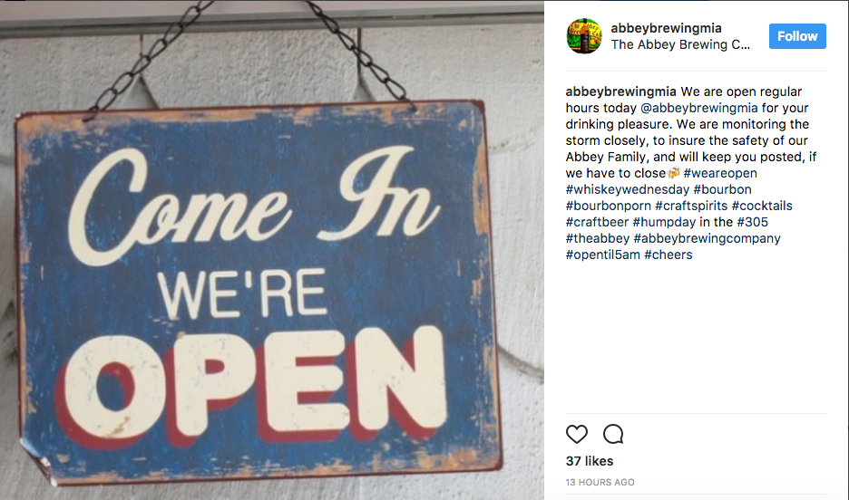 The taproom lies in an evacuation zone and, according to Instagram, is “monitoring the storm closely, to insure the safety of the Abbey Family.”