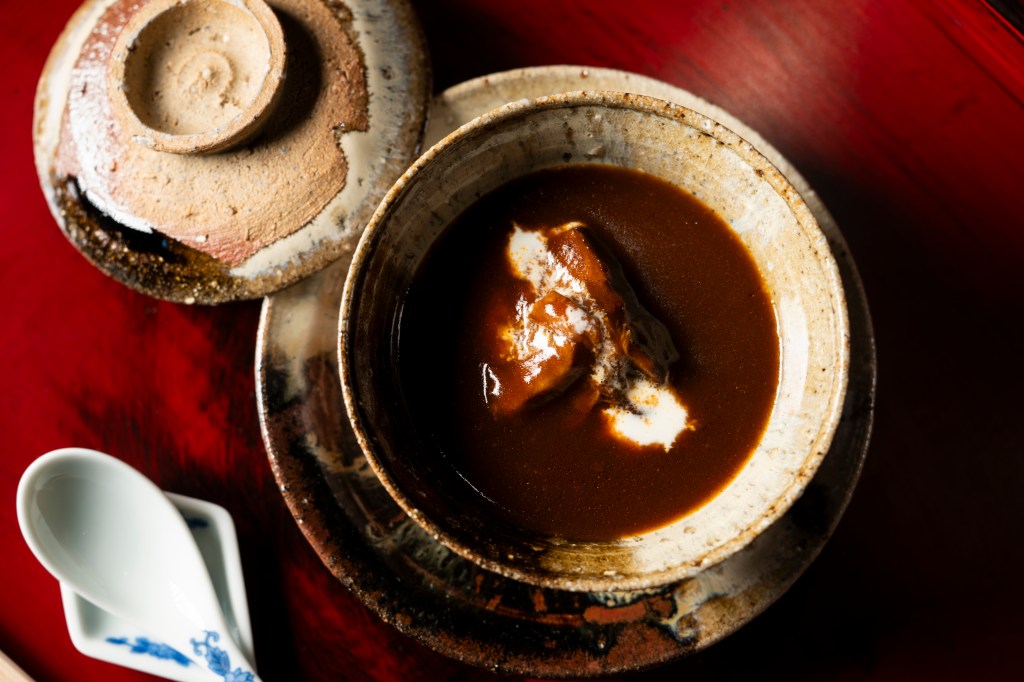 The meal follows the kaiseki (traditional multi-course) format, focusing on pacing and temperature. It starts with nikusui (clear beef broth), an umami-rich soup meant to wake up the palate. That is followed by a beef cutlet sandwich made with Kobe tenderloin and a “taco” that swaps the tortilla for a shiso leaf and lettuce, topped with aged Gruyère and a raw egg yolk mixed at the counter.