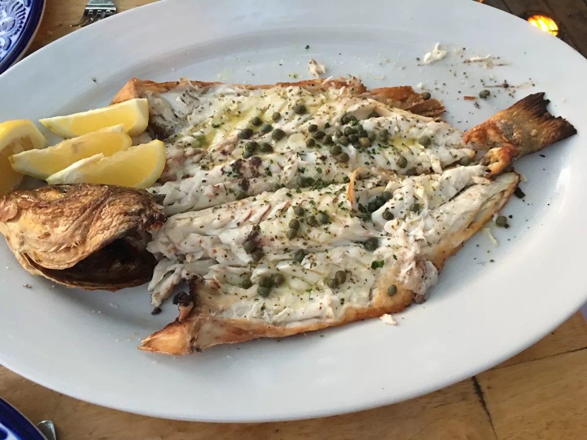 Lavraki, or Mediterranean sea bass, is grilled and then baked in the oven (market price). The fish is dressed with olive oil, oregano, salt, pepper, and capers. It’s incredibly juicy, and the skin has a delicate crunch. It’s hard to find any fault with this preparation. Other whole seafood options include the Greek tsipoura, local red snapper, and whole grilled lobster. A side of homemade fries sprinkled with oregano, lemon, and a generous amount of feta is a great accompaniment to any fish main course.