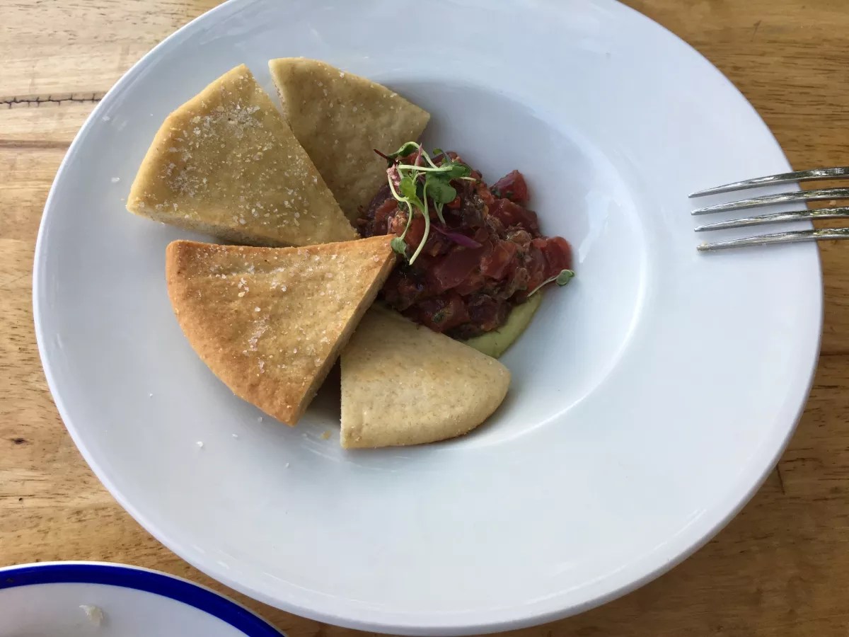 Dip the crisp and salty pita chips into the center-cut tuna tartare ($21), arranged on creamy avocado purée. This starter is light, fresh, and flavorful and is sure to hit the spot on a warm summer night.