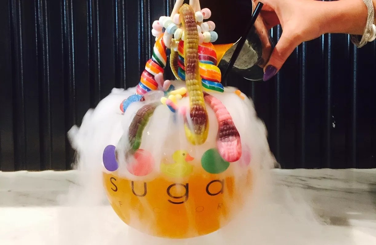 Sugar Factory. Find whimsical desserts such as the Trick or Treat milkshake, the Cookie Monster, white-chocolate pretzel witches’ fingers, and white-chocolate Twinkie mummies. There’s also the sharable Lollipop Brew Goblet ($42), a colossal cocktail containing citrus vodka, sour mix, and cantaloupe and brimming with Halloween-themed goodies such as a candy necklace, gummy snakes, gummy spiders, and gummy brains. Liquid nitrogen adds a dramatic, steaming-cauldron effect. 643 Lincoln Rd., Miami Beach; 305-674-6670; sugarfactory.com.