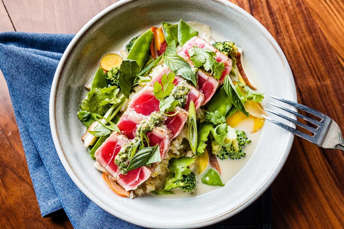 Popular dishes include short-rib potstickers with toasted sesame, cilantro, and ponzu; roasted turkey French dip with horseradish aioli and Havarti cheese on a garlic Parmesan roll; Scottish salmon with Chioggia beets, toasted grains, watercress, and Marcona almond pesto; and Korean USDA Prime skirt steak with spicy double egg fried rice, pickled shiitakes, and ginger.