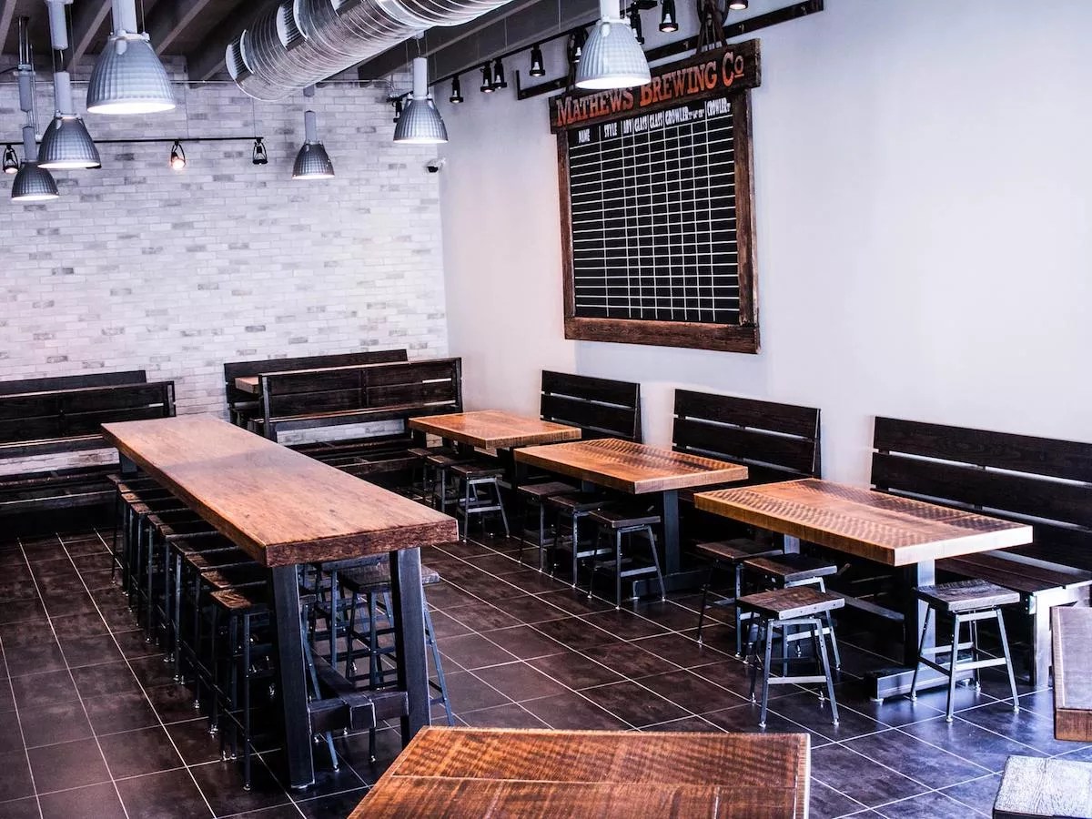 The 117-seat bar and taproom will offer 14 taps pouring Mathews Brewing Co. beers alongside several guest taps. Four additional beer engine handles, a traditional British beer-dispensing device, will be used to pump all cask-conditioned ales, including a dark mild and English IPA, from the cellar to the bar. The brewery will also offer a large outdoor beer garden with a live-music stage and dog-friendly patio.