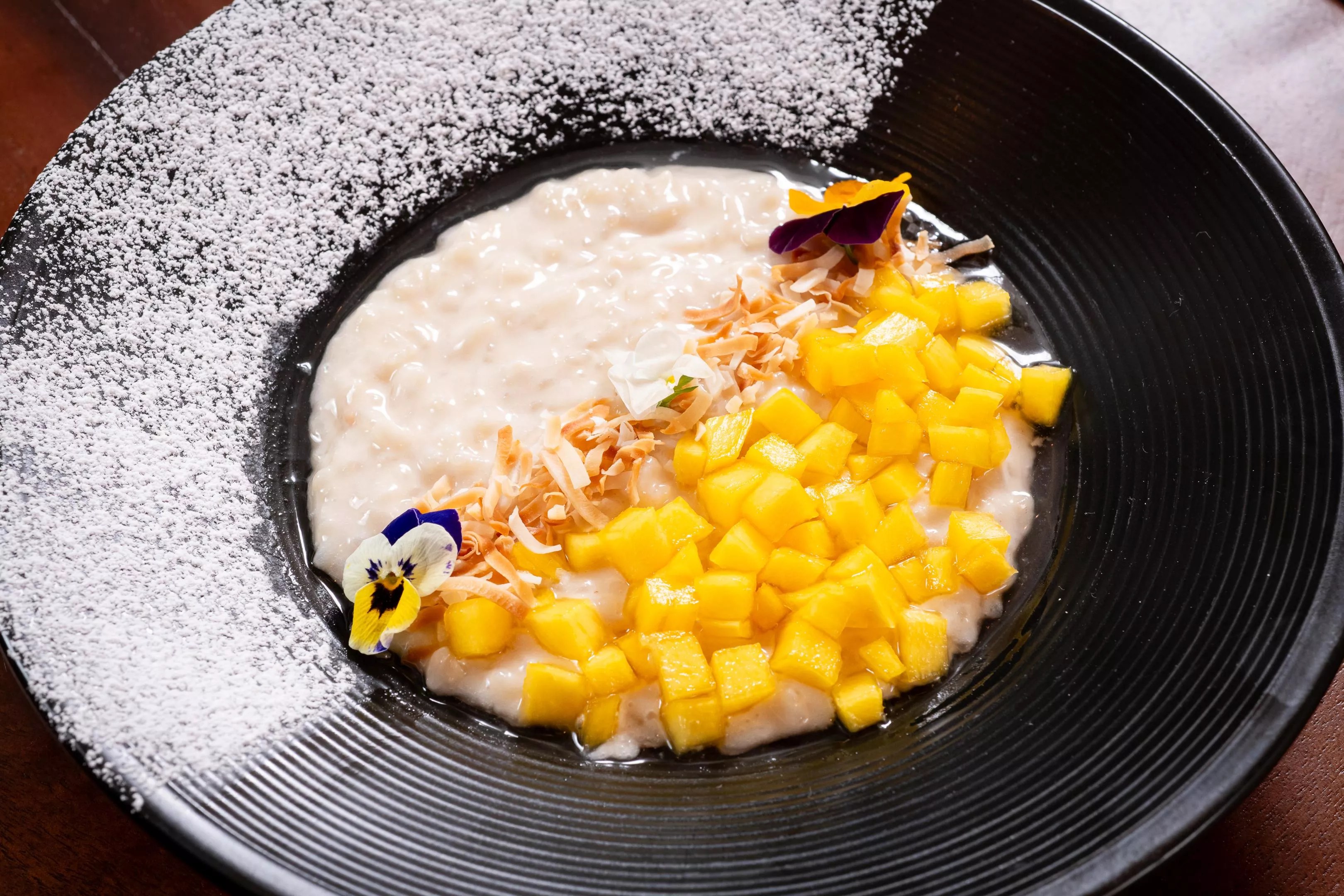 Andy explains that the dish started as a joke, but it turned into a variation of the dish Julio had in Thailand. The arroz con mango is a vegan arroz con leche made with coconut milk, rice, and mango and toasted coconut on top.