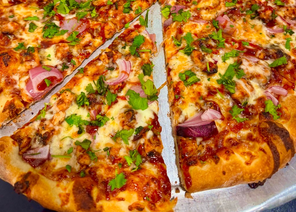 The pies lean on a 1959 Detroit family recipe that Thad has been refining for years. The result isn’t exactly New York, and it isn’t exactly Detroit. It’s thinner, crispier, and lighter, balanced with California tomatoes, a rich cheese blend, and toppings chosen for both texture and taste. Sure, you’ll find the classics, but the house specialties give the menu some swagger. The “BBQ Chicken Pizza” (featuring grilled chicken breast, red onions, a barbecue sauce base, and a drizzle on top) is already drawing fans, and the “Goat Pizza” (goat cheese, spinach, mushrooms, artichokes, and a touch of truffle oil) is another standout.