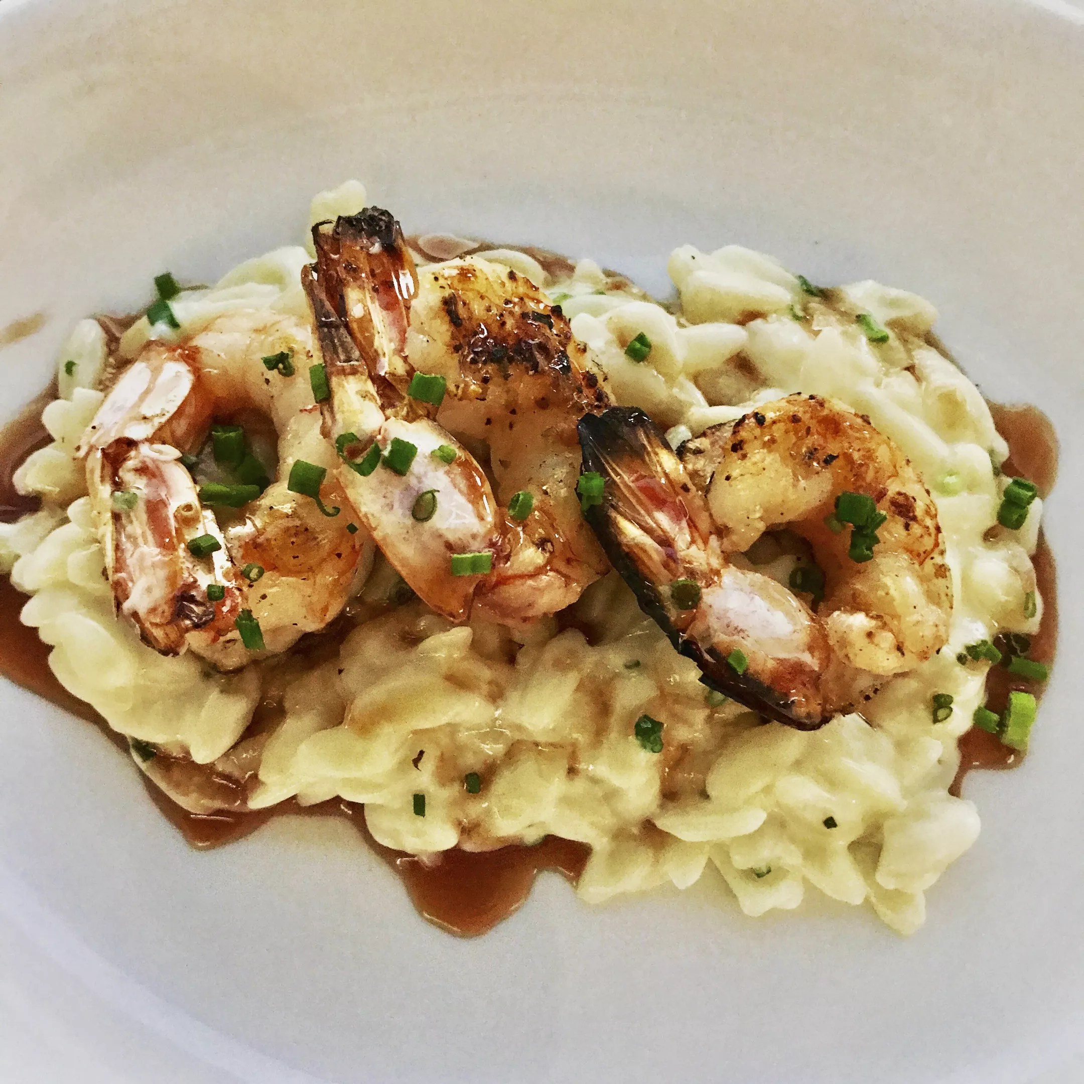For dinner, have several options for the first course, including a half-dozen oysters served with lemon, cocktail sauce, and mignonette; stuffed eggplant with feta, crab, thyme, lemon, and Greek salsa; and royal red shrimp served over “orizotto,” a combination of orzo and risotto. The shrimp, from Argentina, are large and juicy and come dressed in a slightly spicy red wine gastrique.