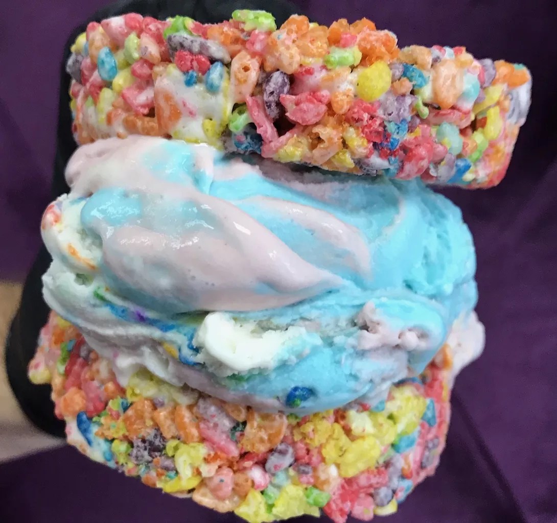 Fruity pebbles ice cream sandwich.