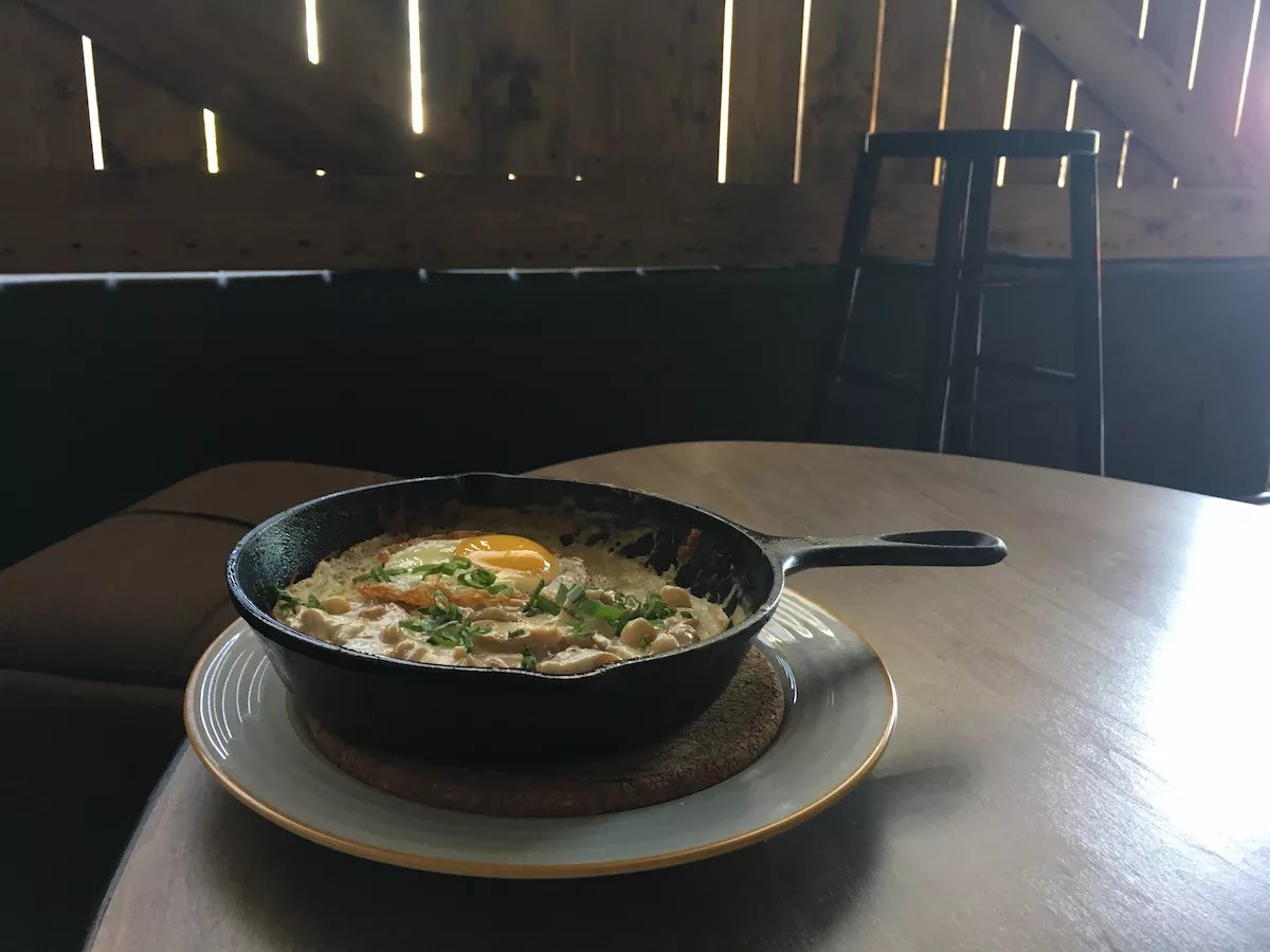 The place serves beer and wine, along with an all-day menu that starts (at 9 a.m.) with a thankfully savory-leaning list of breakfast options ranging from an omelet with potatoes, olives, red onions, chorizo, and cheddar ($12) to corned-beef hash ($10). The Dutch baby ($12) arrives in a cast-iron pan with an over-easy egg and a smattering of cremini and oyster mushrooms in a velvety sauce. The pancake itself, rather than being the classic crisp-edged. eggy sort of crepe, is a bit starchier and fluffier than the traditional variety but is a good vehicle for sopping up the dish’s fatty yolk and sauce.