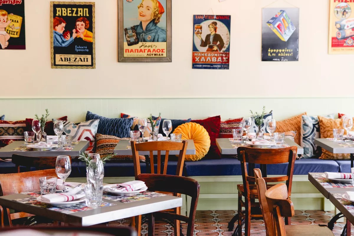 The décor of Bakaló Miami is inspired by old-time Greek bistros, dotted with posters from the 1950s and ’60s that the owners discovered at flea markets in Athens, Greece. The space includes an open-air kitchen and an outside patio for folks to enjoy alfresco dining.