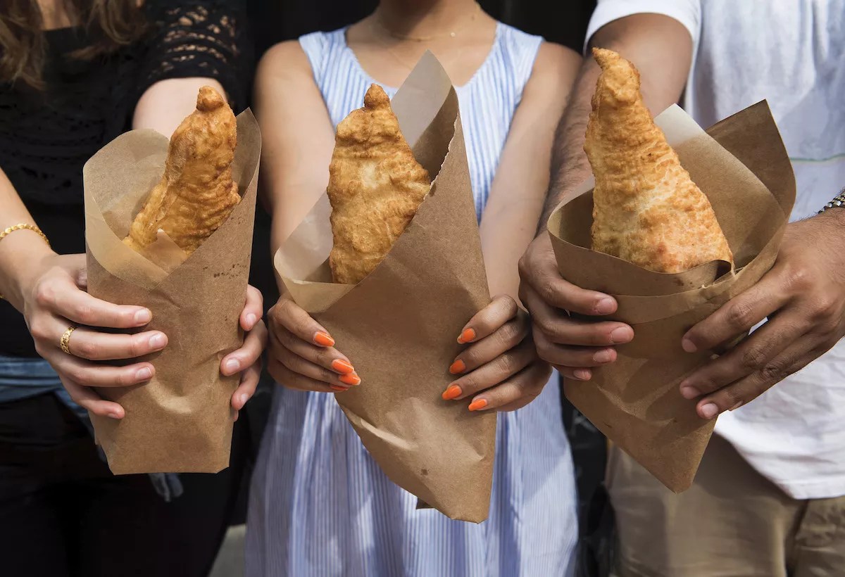 Today Sorbillo is known for churning out a slightly larger version of Neapolitan pies. Described as incredibly light, they’re cooked in wood ovens and use limited ingredients, including 00-graded flour and San Marzano tomatoes. Typically served unsliced, the pies arrive with a sauce-heavy center and a chewy, fire-charred crust.