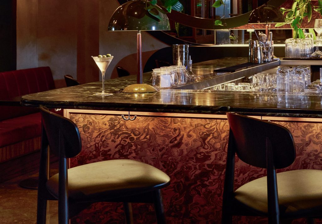 The dining room leans toward a steakhouse tone with dark wood, stone surfaces, velvet seatin,g and low lighting. Burgundy banquettes, white tablecloths, and bold Italian artwork set a more formal mood than most North Beach openings, while millwork incorporates subtle references to Miami’s Art Deco and postmodern design.