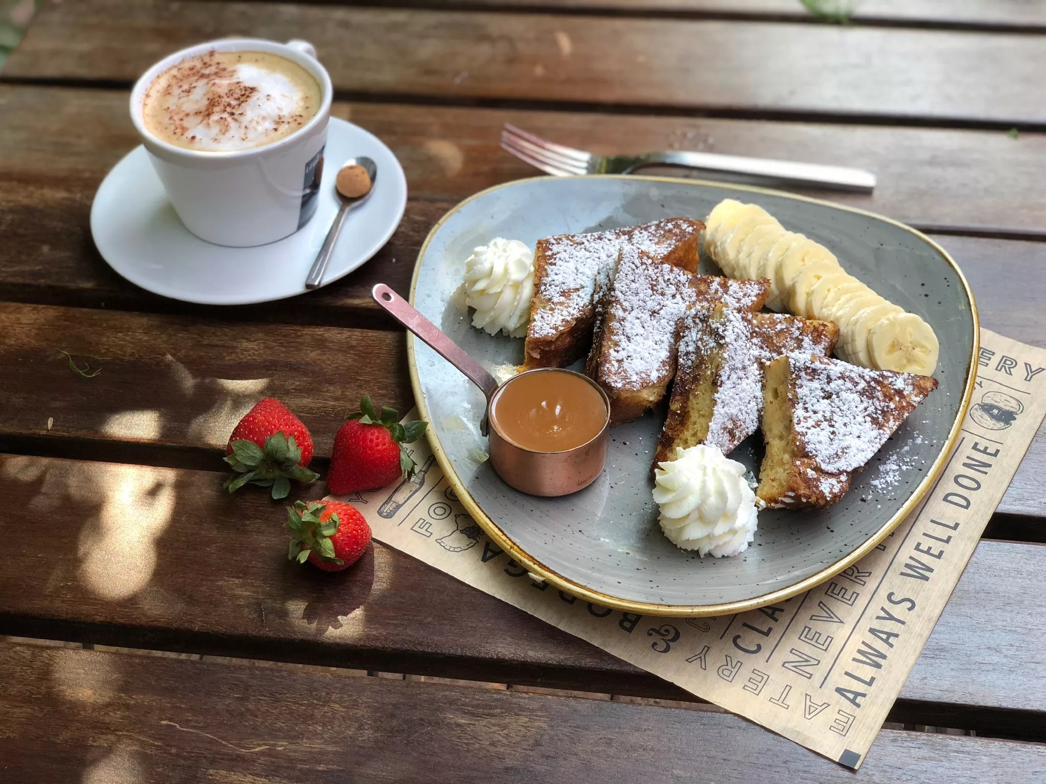 Recently added sweet items include the French toast Argentino, in which slices of brioche are garnished with condensed milk, dulce de leche, and whipped cream; or the bacon pancakes, where a stack of three buttermilk pancakes are topped with candied bacon shards and bacon-infused maple syrup.
