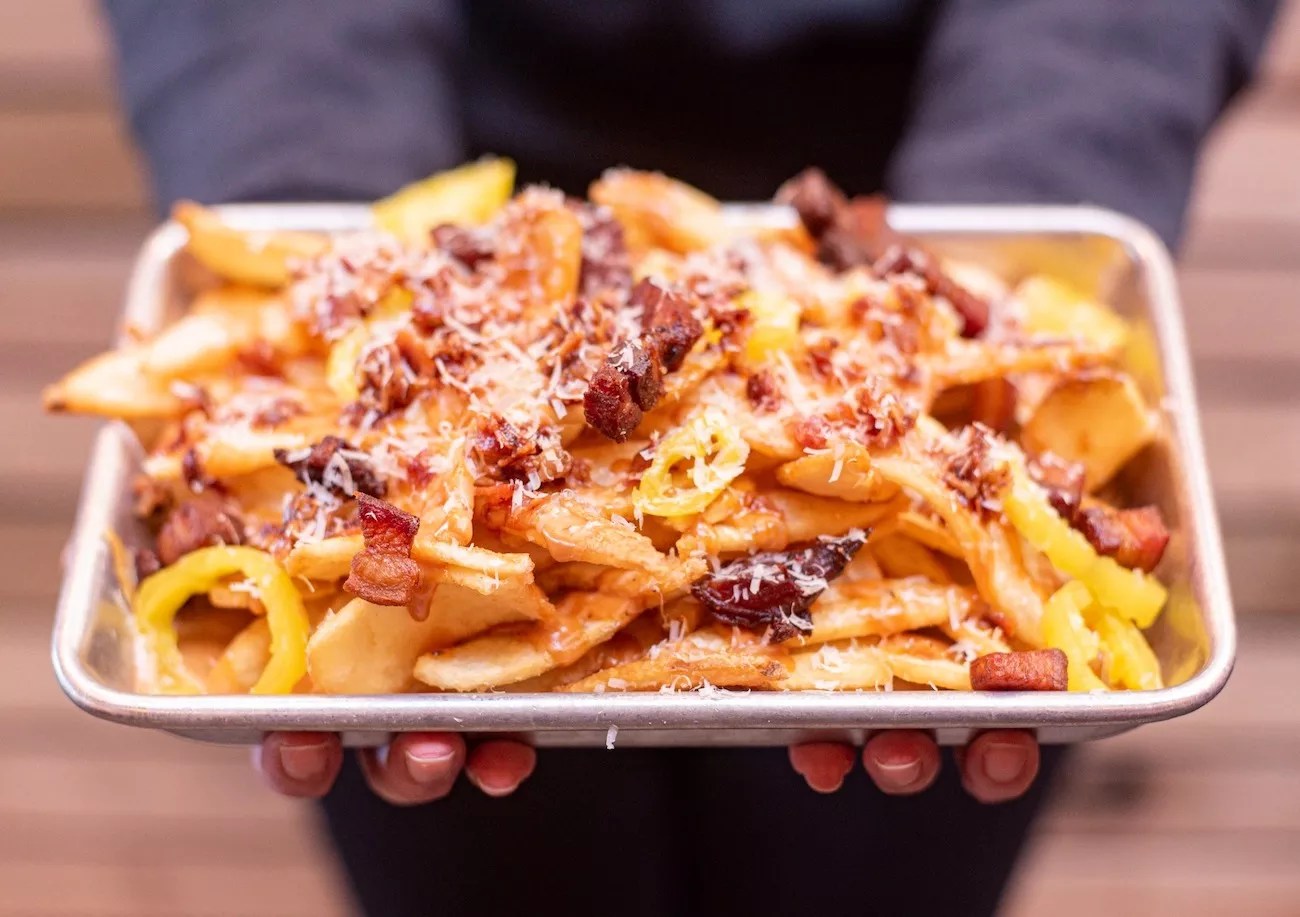 Big Chicken’s “Dirty Fries” have arrived on the scene to make us all realize In-N-Out’s “Animal-Style Fries” aren’t all that scary. This fiery explosion of a culinary creation comprises a mountainous base of fries generously smothered in cheese sauce, topped with crispy bacon and zesty banana peppers, then drizzled with chipotle barbecue sauce.