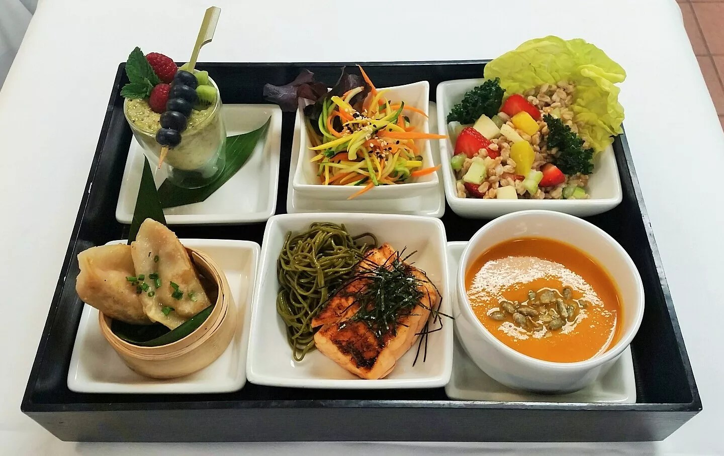 “We have a very talented culinary team who have created a specific bento box incorporating superfoods and foods with high antioxidant properties.” The menu includes carrot-and-ginger soup and miso-honey-grilled salmon and farro – an ancient grain similar to quinoa – prepared in a salad with squash and apples.