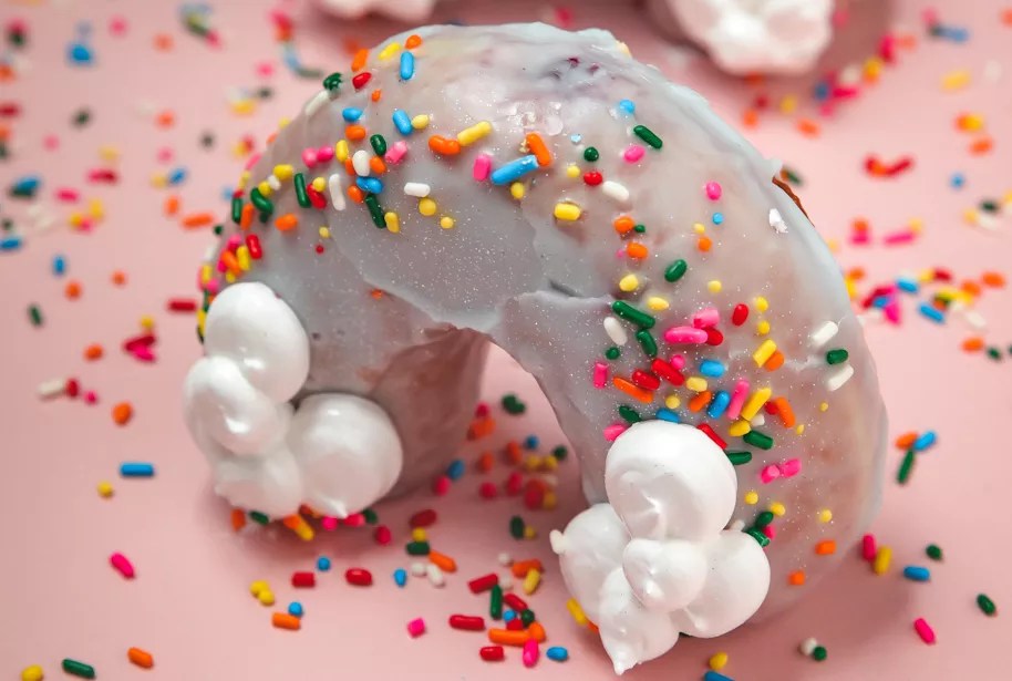 The rainbow-shaped doughnut is glazed with sweet cream and topped with rainbow sprinkles.