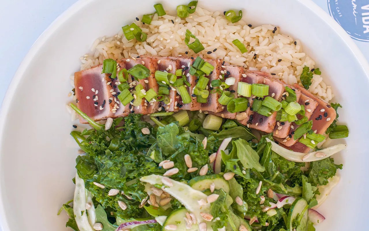Wild ahi tuna, cilantro rice, and house salad from Pura Vida.