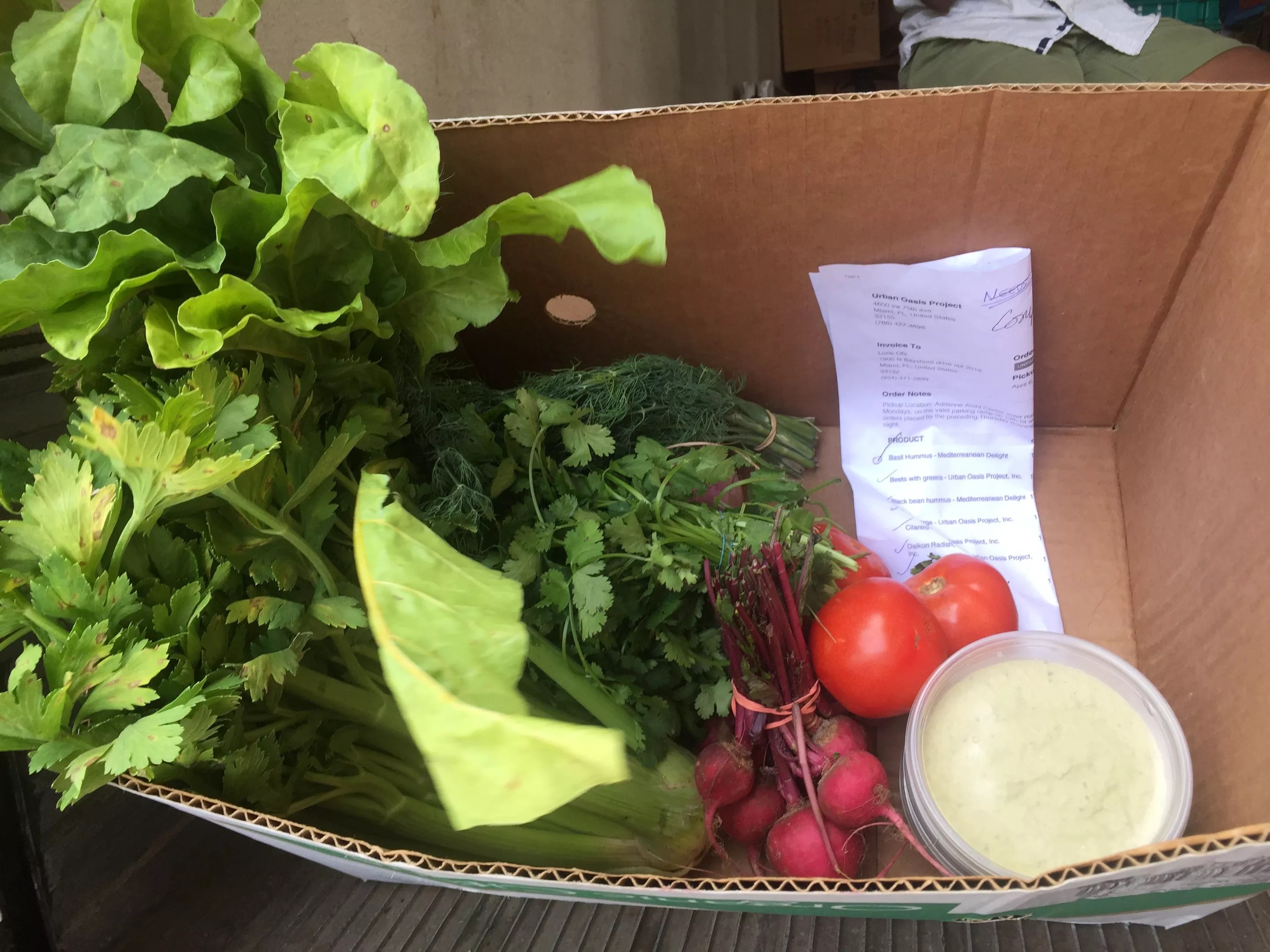 A COVID-safe, pre-packed veggie box, ordered ahead of time from the Urban Oasis Project website.